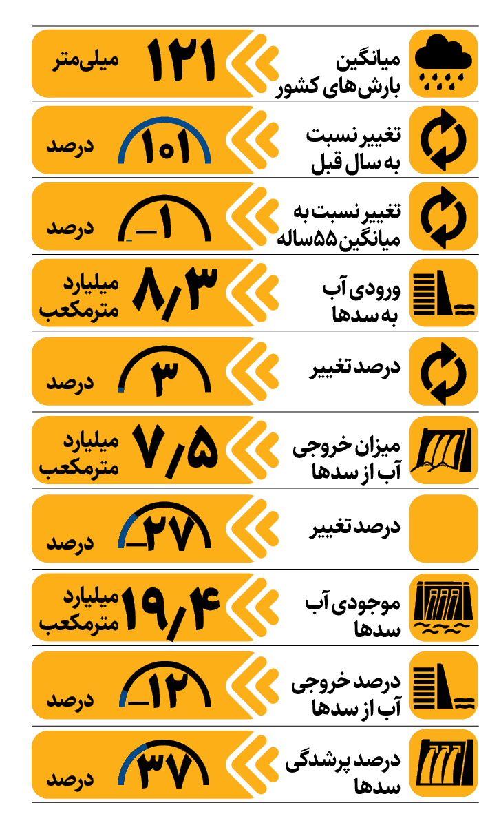 بارندگی‌های امسال نسبت به سال قبل مساعدتر بود؛ اما هنوز به میانگین بلندمدت نرسیده است. در این میان، مخازن سدها همچنان کم آب است و 63درصد آن خالی است. براساس آمارهای وزارت نیرو، در سال آبی جاری (اول مهر تاکنون) ارتفاع کل ریزش‌های جوی کشور به 121میلی‌متر رسیده که نسبت به سال قبل 101درصد بیشتر است اما هنوز حدود یک درصد کمتر از میانگین بارش‌ها در دوره مشابه 55ساله است. نگاهی به مخازن سدها نشان می‌دهد بهبود بارش‌های امسال، در بهترین حالت ‌ بخشی از کسری بارندگی سال قبل را جبران کند و روی ذخیره آبی سدها تأثیر شگرفی نداشته است. طبق آمارهای حوزه آب، فقط 37درصد سدها آب دارد و 63درصد ظرفیت مخازن خالی است. البته بخش زیادی از بارش‌ها در ارتفاعات به‌صورت برف بوده که در فصل گرما به مخازن سدها تزریق خواهد شد‌.