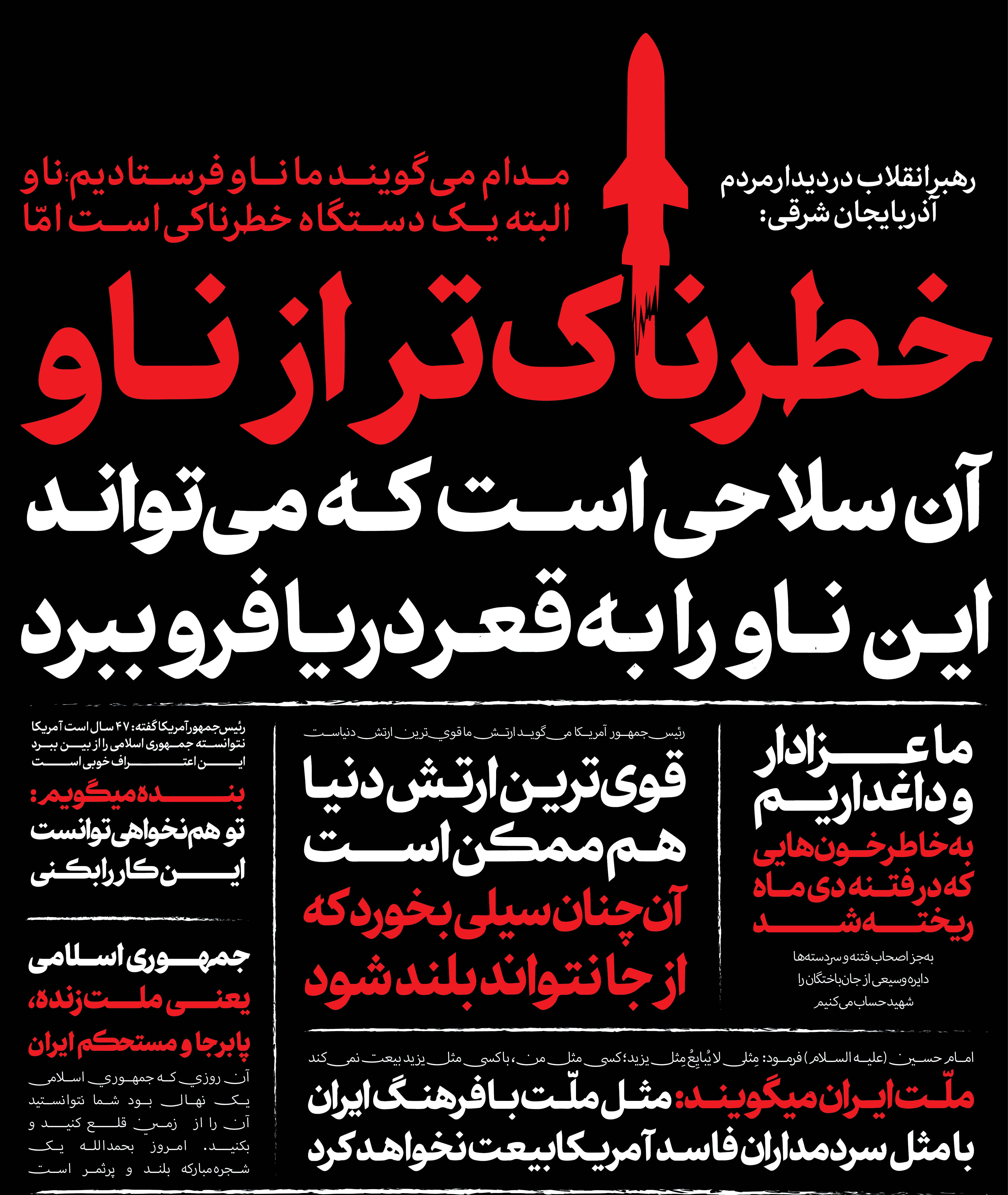 رهبرمعظمانقلاب صبح سهشنبه در دیدار پرشور هزاران نفر از مردم تبریز و آذربایجانشرقی با اشاره به فتنه اخیر، تأکید کردند: ما داغدار و عزادار خونهای ریختهشده در فتنه دیماه هستیم. حضرت آیتالله خامنهای درباره تهدید و اقدام آمریکاییها در اعزام ناو جنگی به سمت ایران، فرمودند: ناو البته دستگاه خطرناکی است، اما خطرناکتر از آن، سلاحی است که میتواند ناو را به قعر دریا بفرستد.