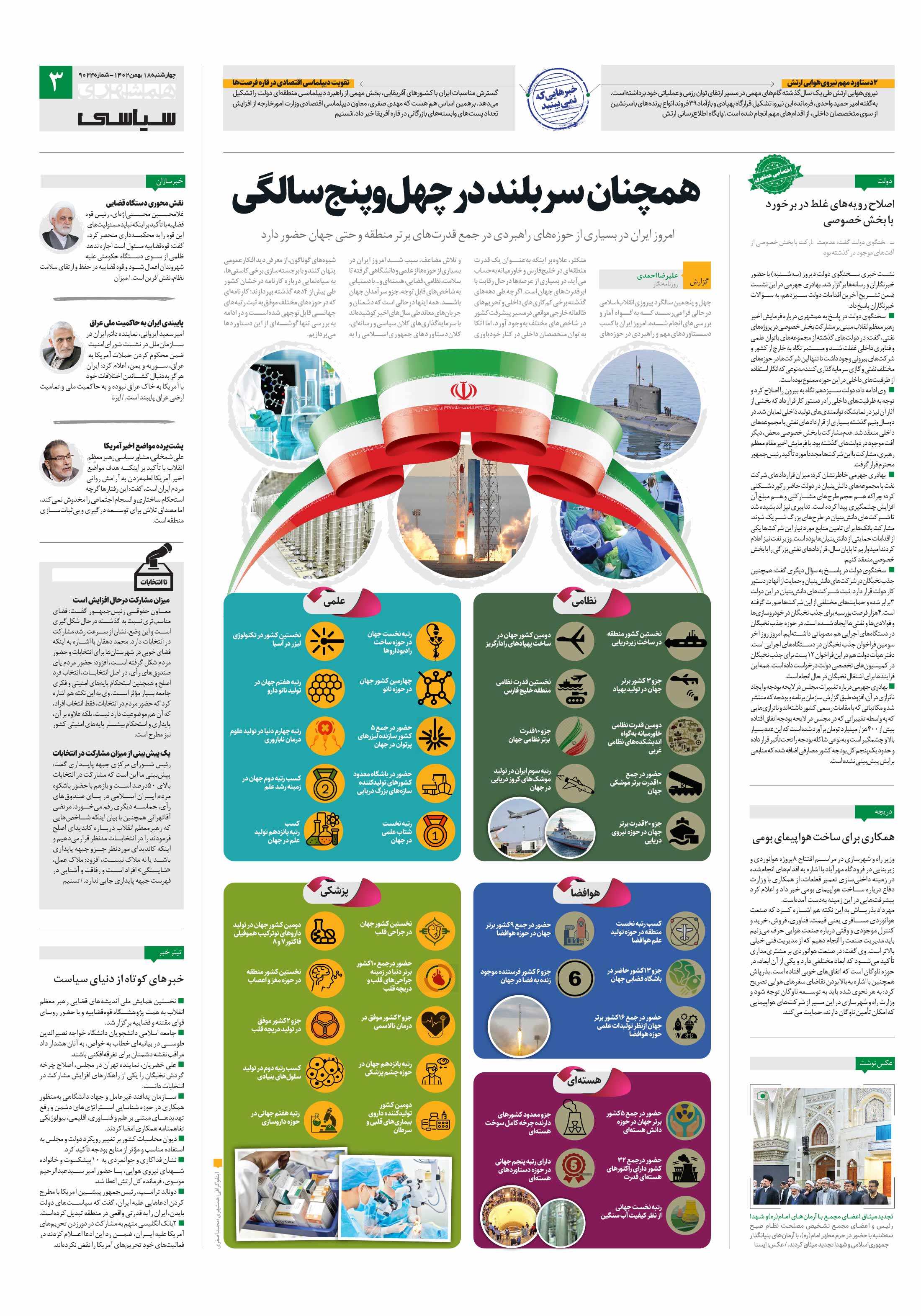چهل و پنجمین سالگرد پیروزی انقلاباسلامی درحالی فرا میرسد که به گواه آمار و بررسیهای انجام شده، امروز ایران با کسب دستاوردهای مهم و راهبردی در حوزههای متکثر، علاوهبر اینکه بهعنوان یک قدرت منطقهای در خلیجفارس و خاورمیانه بهحساب میآید، در بسیاری از عرصهها درحال رقابت با ابرقدرتهای جهان است.