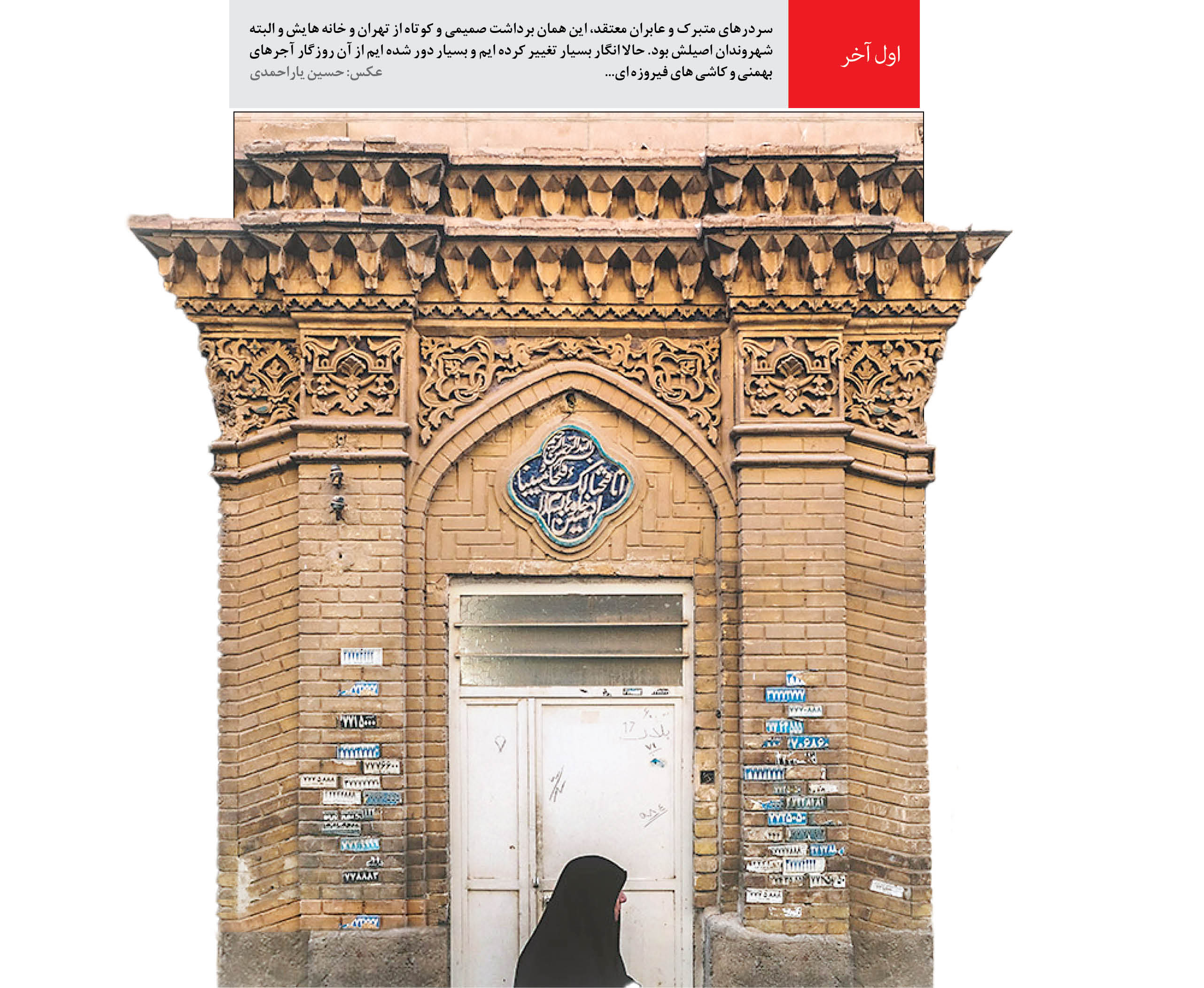 سردرهای متبرک و عابران معتقد، این همان برداشت صمیمی و کوتاه از تهران و خانه هایش و البته شهروندان اصیلش بود. حالا انگار بسیار تغییر کرده ایم و بسیار دور شده ایم از آن روزگار آجرهای بهمنی و کاشی های فیروزه ای...