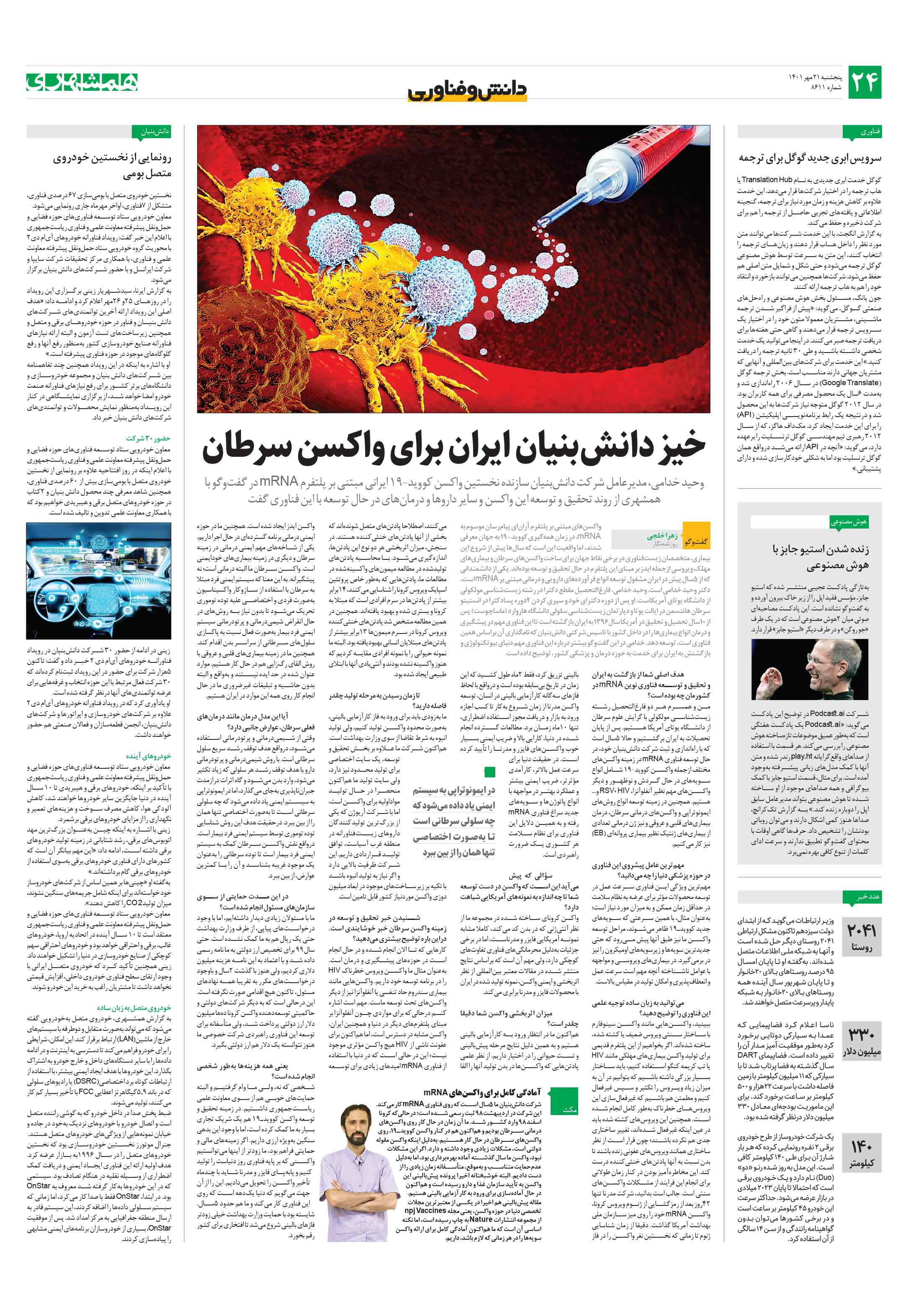 وحید خدامی، مدیرعامل شرکت دانشبنیان سازنده نخستین واکسن کووید-19 ایرانی مبتنی بر پلتفرم mRNA در گفتوگو با همشهری از روند تحقیق و توسعه این واکسن و سایر داروها و درمانهای در حال توسعه با این فناوری گفت
