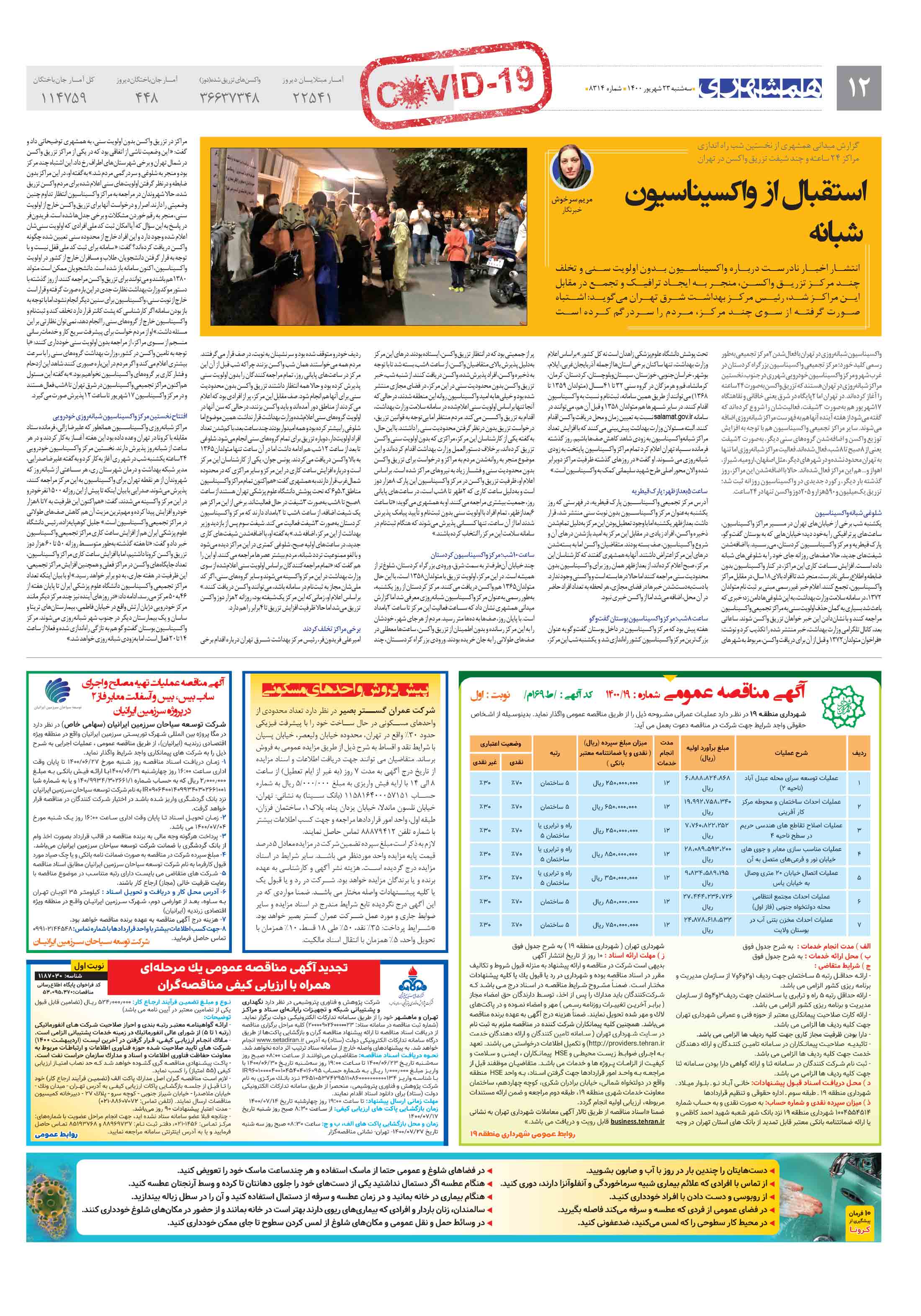 واکسیناسیون شبانهروزی در تهران با فعالشدن 2مرکز تجمیعی بهطور رسمی کلید خورد؛ مرکز تجمیعی واکسیناسیون بزرگراه کردستان در غرب شهر و مرکز واکسیناسیون خودرویی شهرری در جنوب، نخستین مراکز شبانهروزی در تهران هستند که تزریق واکسن بهصورت 24ساعته را آغاز کردهاند.