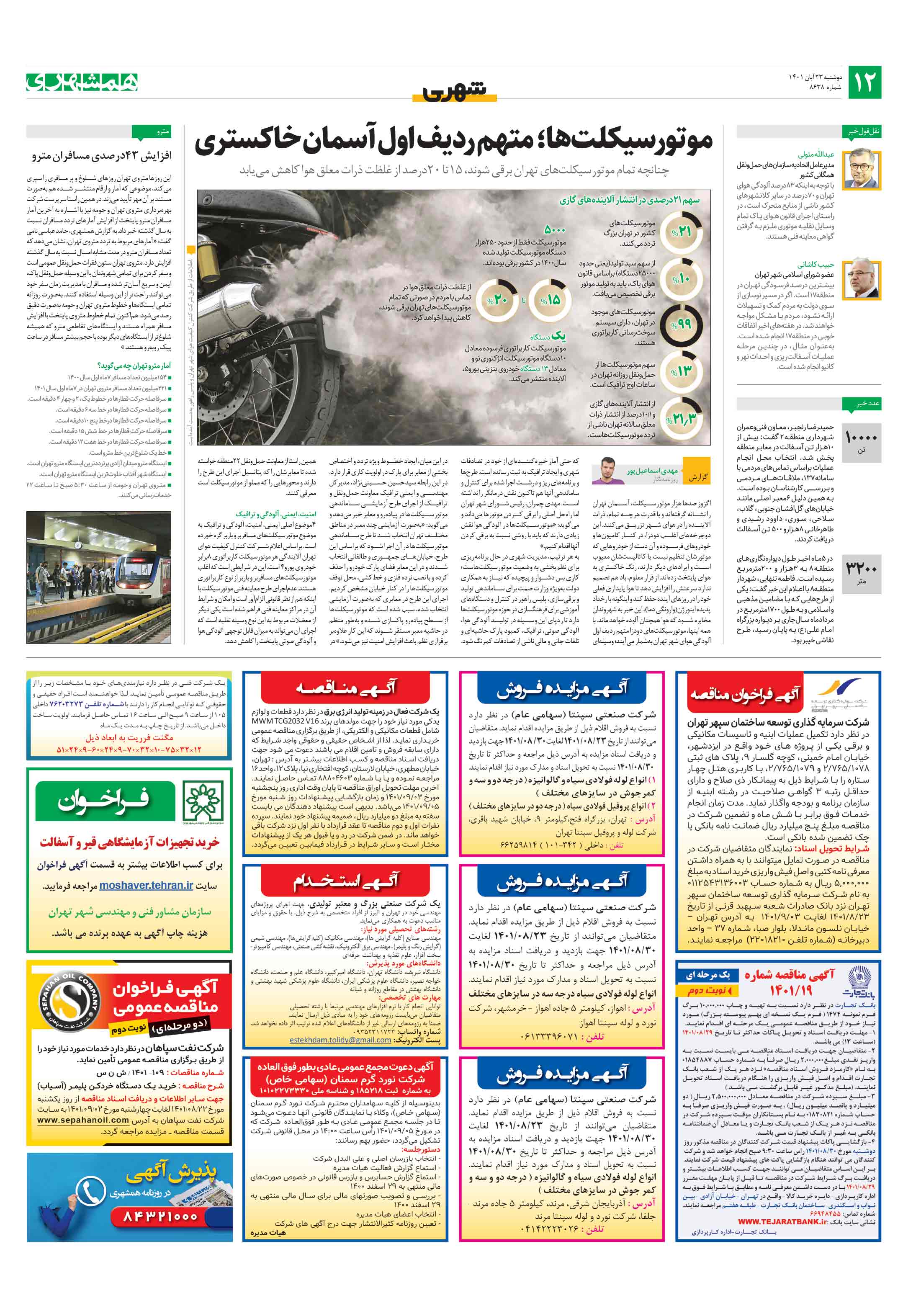 چنانچه تمام موتورسیکلتهای تهران برقی شوند، 15تا 20درصد از غلظت ذرات معلق هوا کاهش مییابد