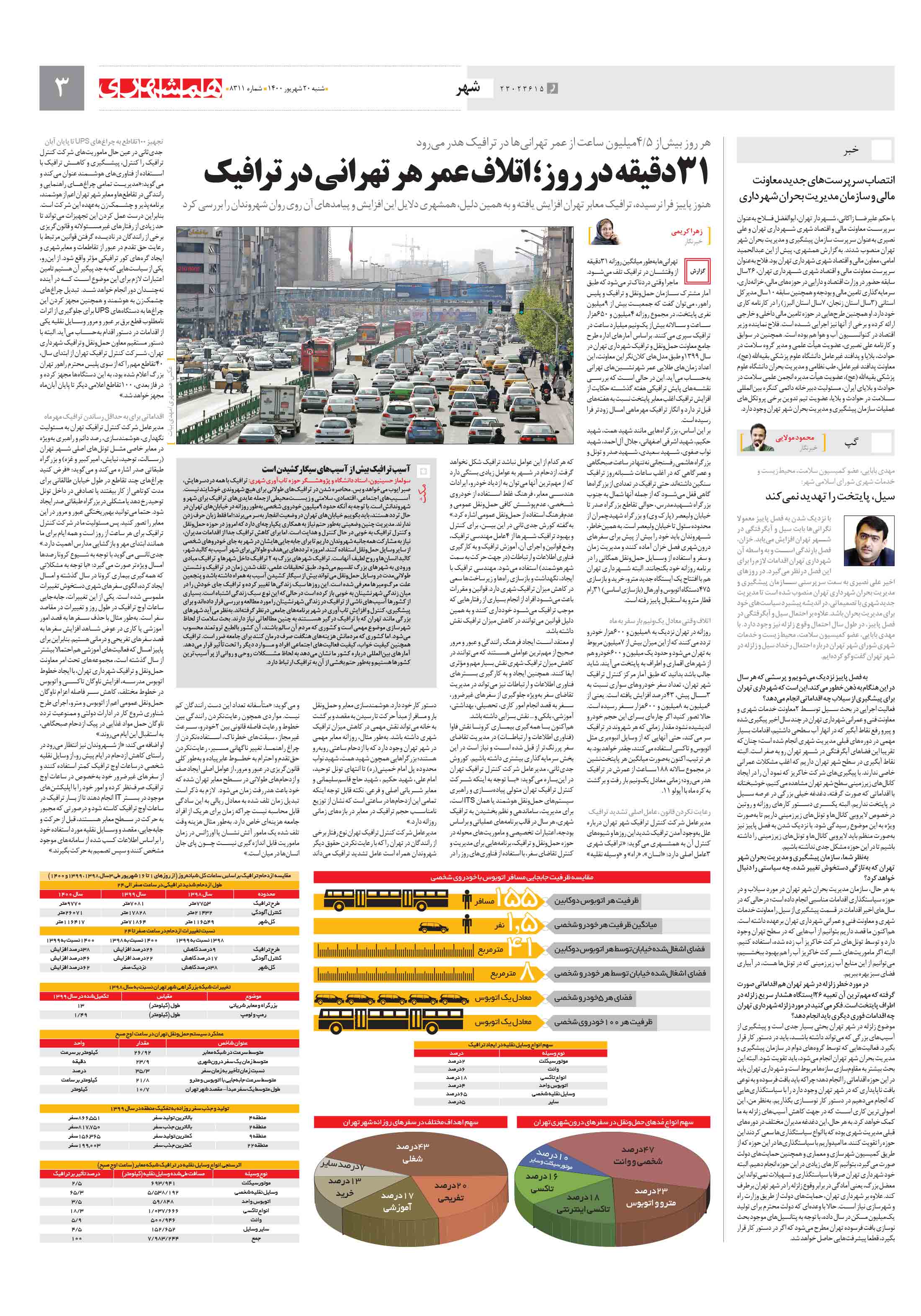 تهرانیها بهطور میانگین روزانه 31دقیقه از وقتشان در ترافیک تلف میشود. ماجرا وقتی دردناکتر میشود که طبق آمار مشترک سازمان حملونقل و ترافیک و پلیس راهور، میتوان گفت که جمعیت بیش از 9میلیون نفری پایتخت، در مجموع روزانه 4میلیون و 650هزار ساعت و سالانه بیشاز یکونیم میلیارد ساعت در ترافیک سپری میکنند.