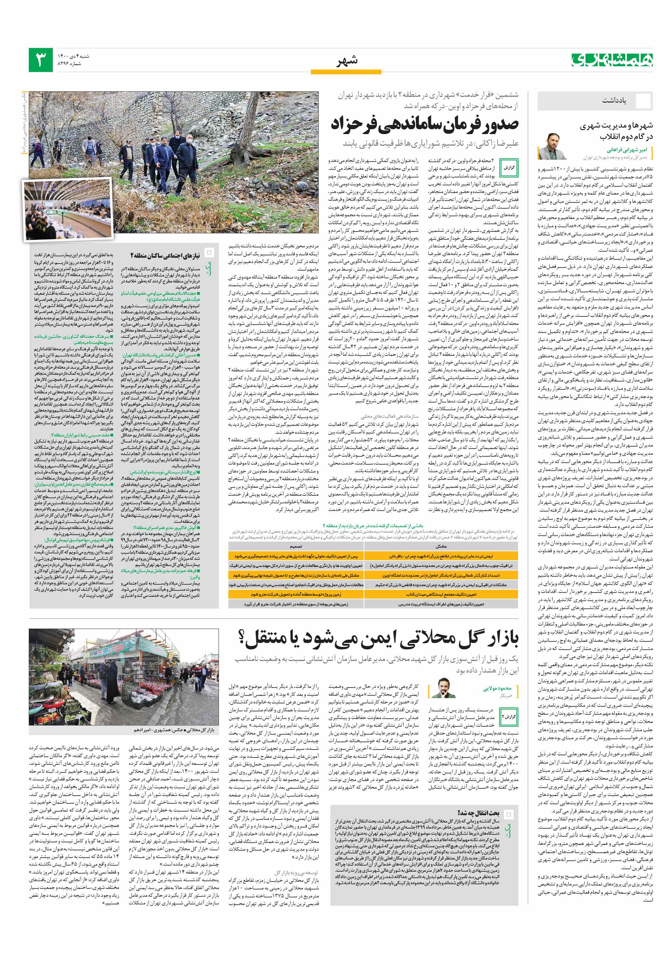 2 محله فرحزاد و اوین-درکه در گذشته از مناطق ییلاقی سرسبز حاشیه تهران بودند که رشد نامتناسب شهر و برخی کاستیها شکل امروز آنها را تغییر داده است. تخریب فضای سبز، اراضی رهاشده و حضور معتادان متجاهر، فضای این محلهها در شمال تهران را تحتتأثیر قرار داده است. اکنون این محلهها نیازمند اجرای برنامههای شهری برای بهبود شرایط زندگی ساکنانشان هستند.
