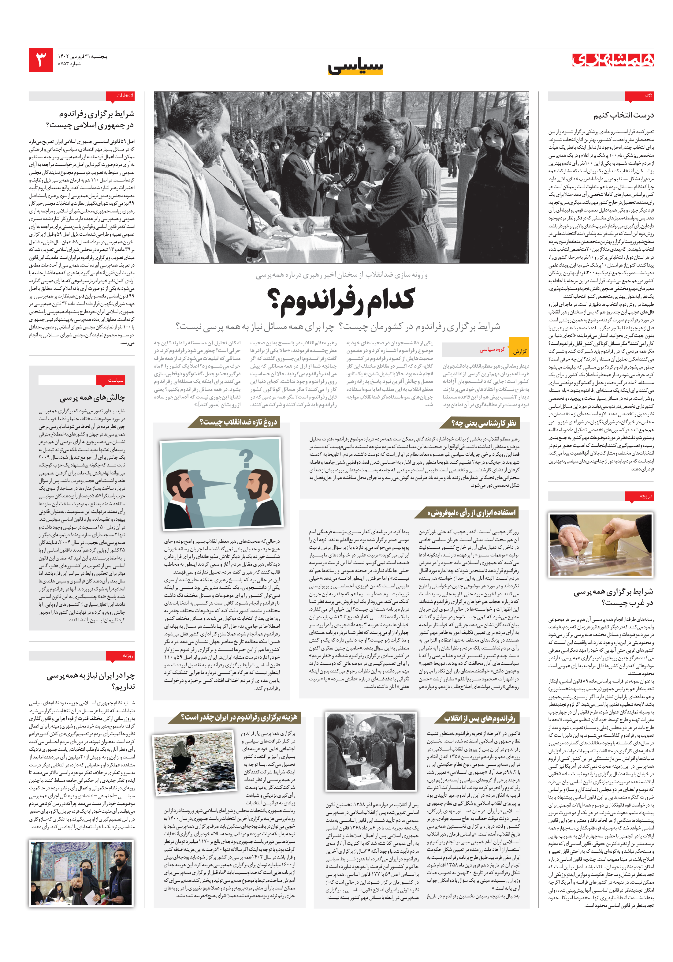 اصل ۵۹ قانونی اساسی جمهوری اسلامی ایران تصریح میدارد که در مسائل بسیار مهم اقتصادی، سیاسی، اجتماعی و فرهنگی ممکن است اعمال قوه مقننه از راه همهپرسی و مراجعه مستقیم به آرای مردم صورت گیرد.