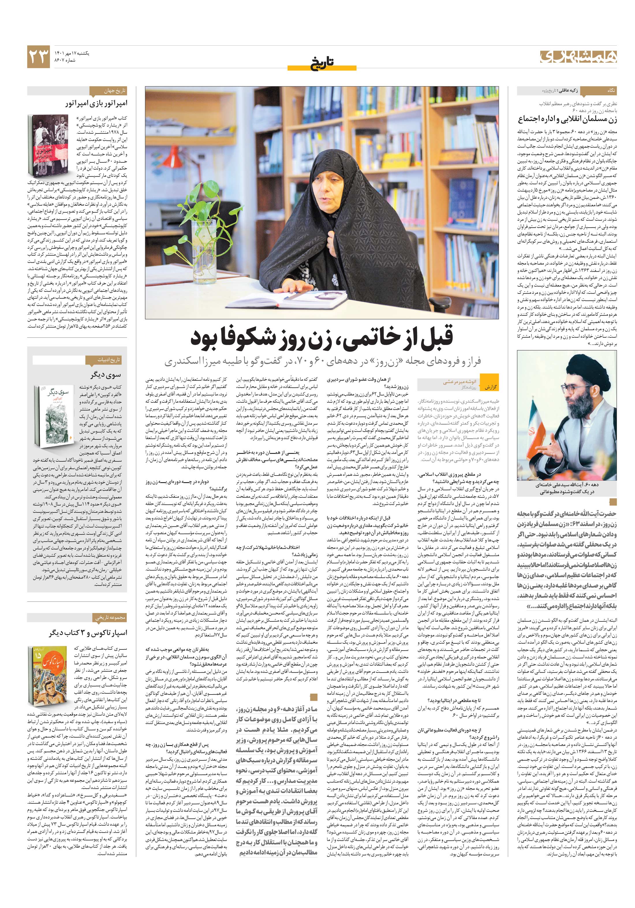 مجله «زن روز» در دهه 60، مجموعا 3 بار با حضرت آیتالله سیدعلی خامنهای مصاحبه کرده است.