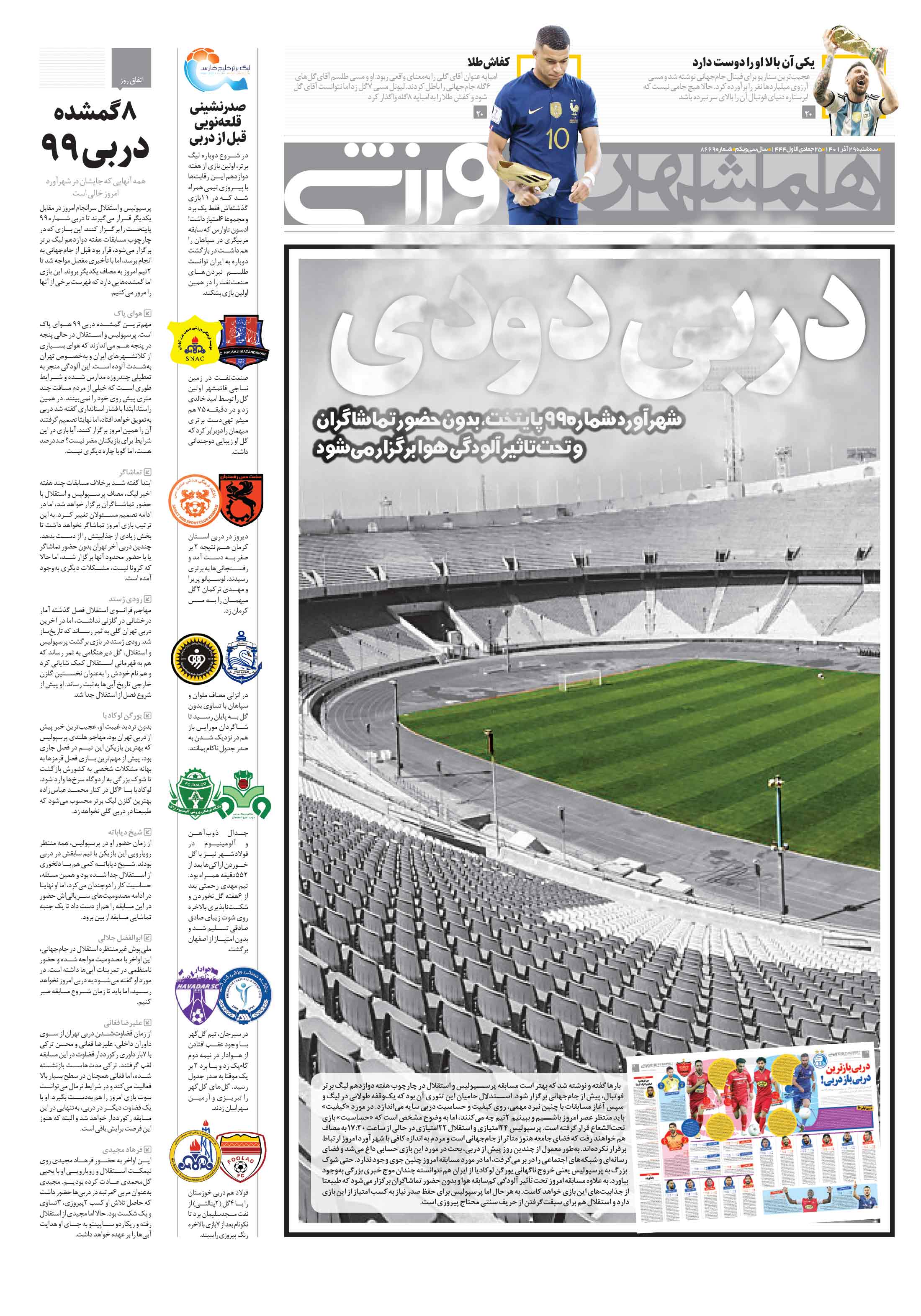 شهرآورد شماره99 پایتخت، بدون حضور تماشاگران و تحتتأثیر آلودگی هوا برگزار میشود