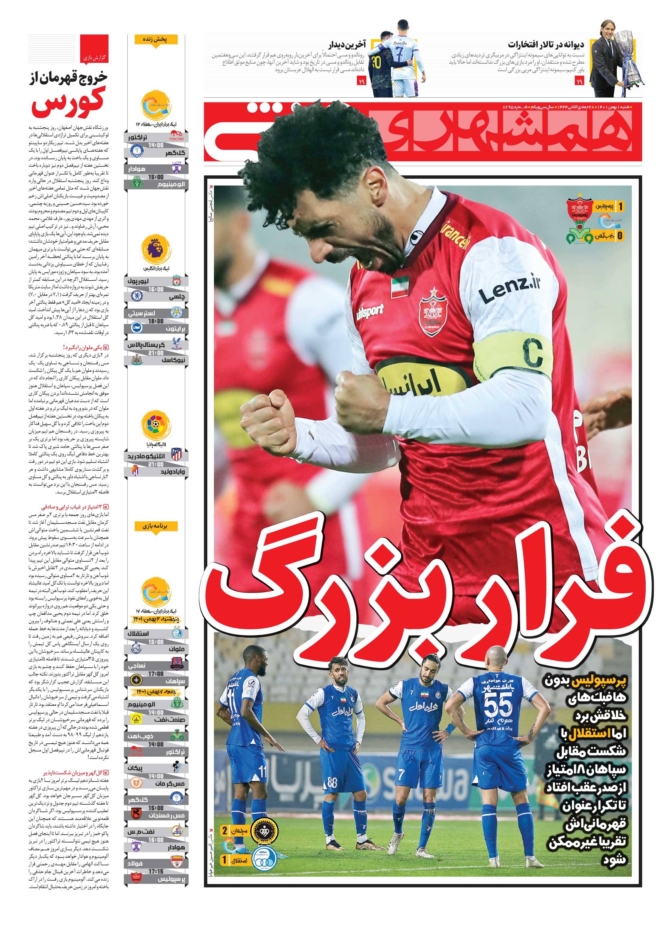 پرسپولیس بدون هافبکهای خلاقش برد اما استقلال با شکست مقابل سپاهان 8امتیاز از صدر عقب افتاد تا تکرار عنوان قهرمانیاش تقریبا غیرممکن شود