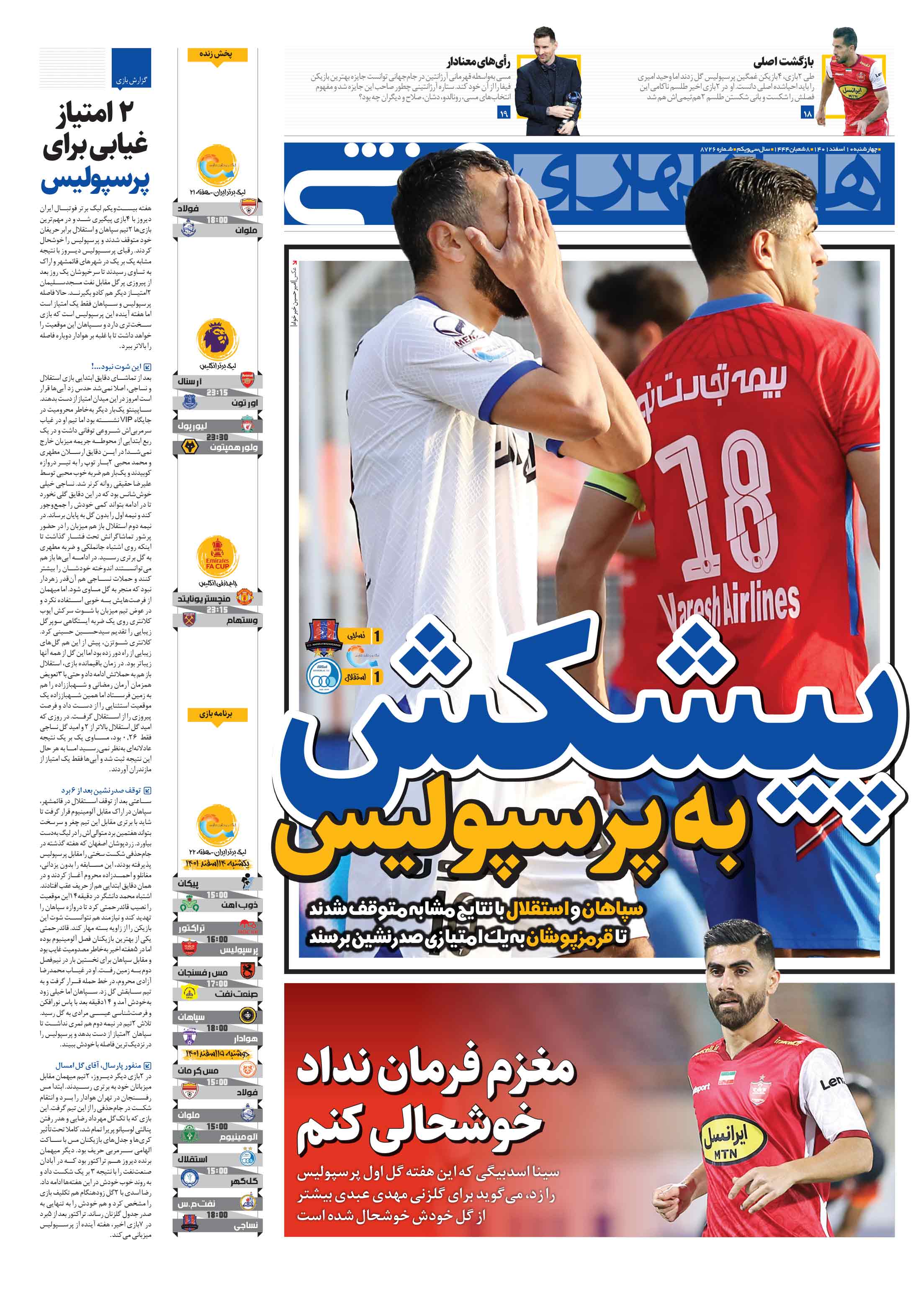 هفته بیستویکم لیگ برتر فوتبال ایران دیروز با 4بازی پیگیری شد و در مهمترین بازیها 2تیم سپاهان و استقلال برابر حریفان خود متوقف شدند و پرسپولیس را خوشحال کردند.