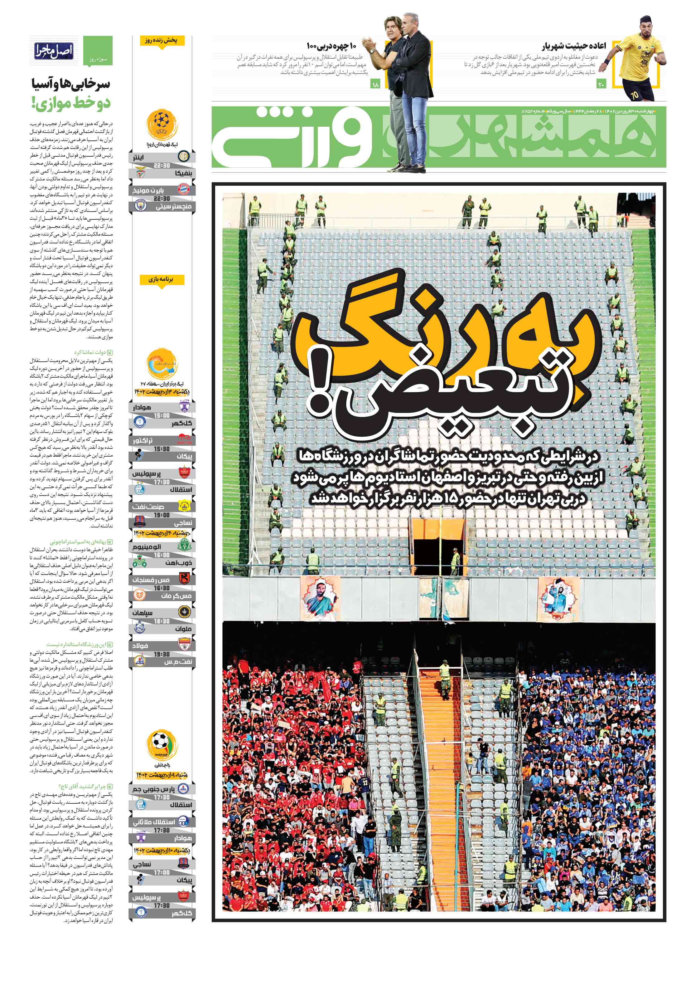 در شرایطی که محدودیت حضور تماشاگران در ورزشگاهها از بین رفته و حتی در تبریز و اصفهان استادیومها پر میشود دربی تهران تنها در حضور 15 هزار نفر برگزار خواهد شد