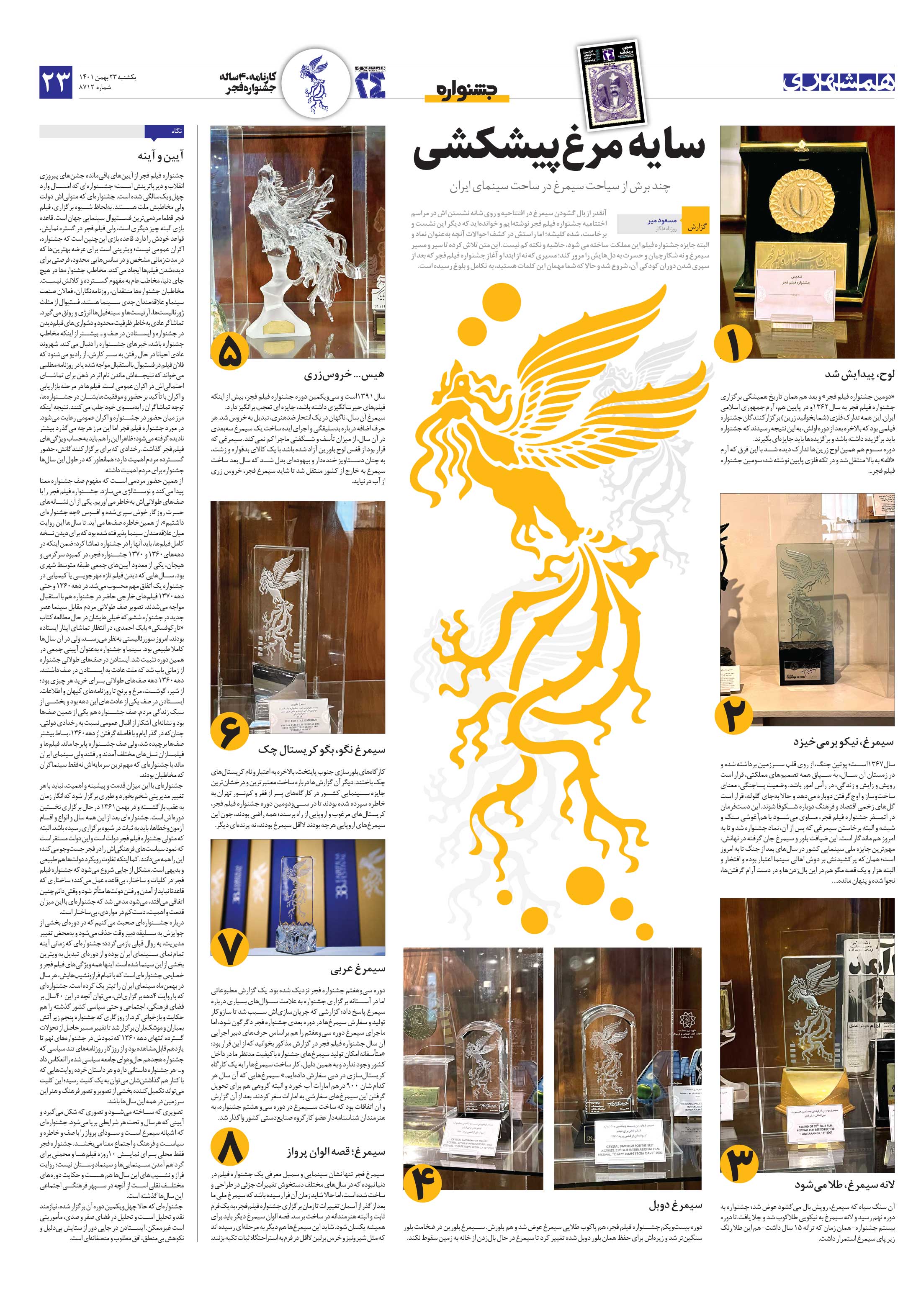 آنقدر از بال گشودن سیمرغ در افتتاحیه و روی شانه نشستن اش در مراسم اختتامیه جشنواره فیلم فجر نوشتهایم و خواندهاید که دیگر این نشست و برخاست، شده کلیشه؛ اما راستش در کشف احوالات آنچه بهعنوان نماد و البته جایزه جشنواره فیلم این مملکت ساخته می شود، حاشیه و نکته کم نیست.