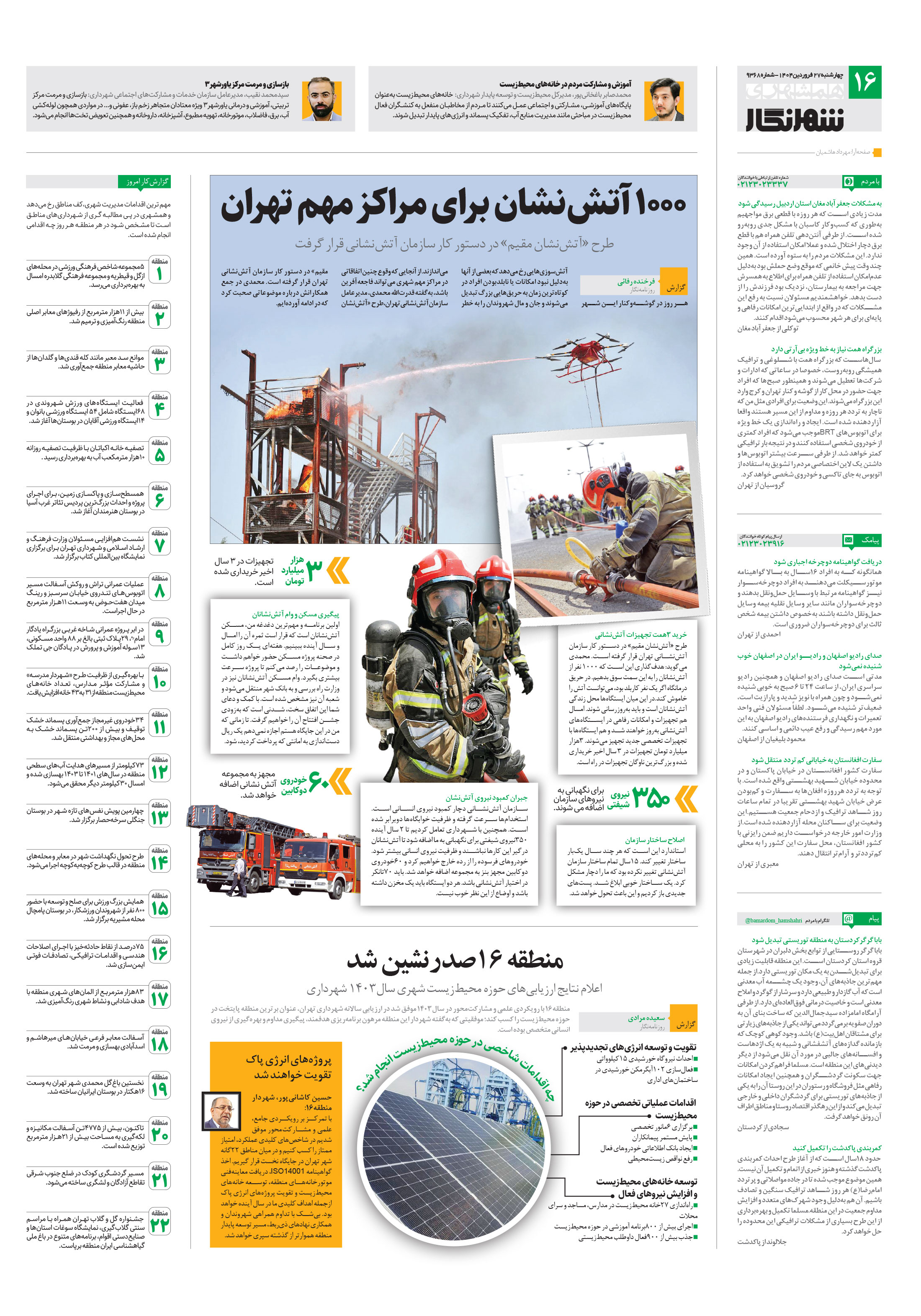 منطقه۱۶ با رویکردی علمی و مشارکتمحور در سال1403 موفق شد در ارزیابی سالانه شهرداری تهران، عنوان برترین منطقه پایتخت در حوزه محیطزیست را کسب کند؛ موفقیتی که بهگفته شهردار این منطقه مرهون برنامهریزی هدفمند، پیگیری مداوم و بهرهگیری از نیروی انسانی متخصص بوده است.