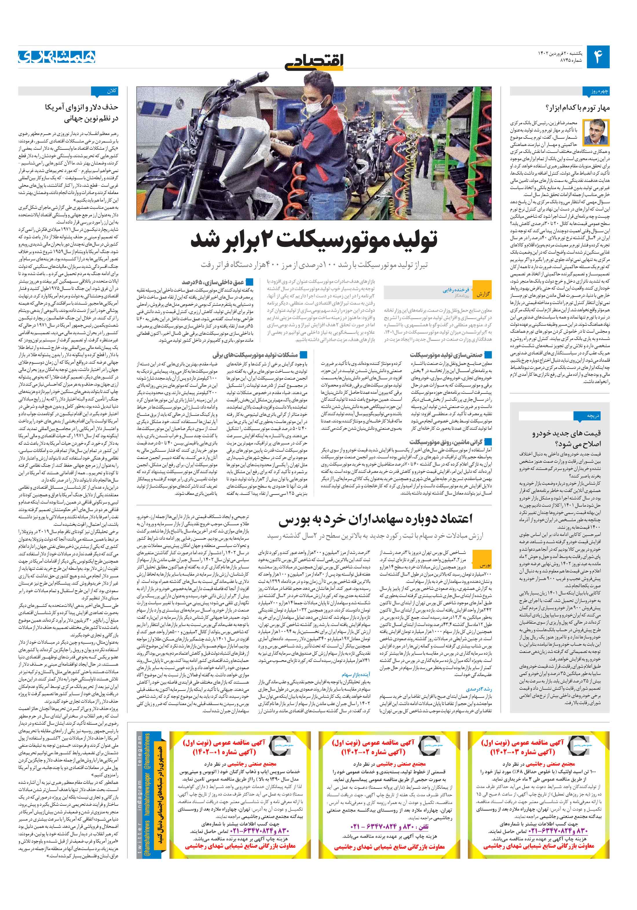 محمدرضا فرزین، رئیسکل بانک مرکزی با تأکید بر مهار تورم و رشد تولید بهعنوان شعار سال، گفت: تورم یک موضوع حاکمیتی و مهار آن نیازمند هماهنگی و همکاری دستگاههای مختلف است، اما نقش بانک مرکزی در این زمینه، محوری است و این بانک از تمام ابزارهای موجود برای تحقق منویات مقام معظم رهبری استفاده خواهد کرد.