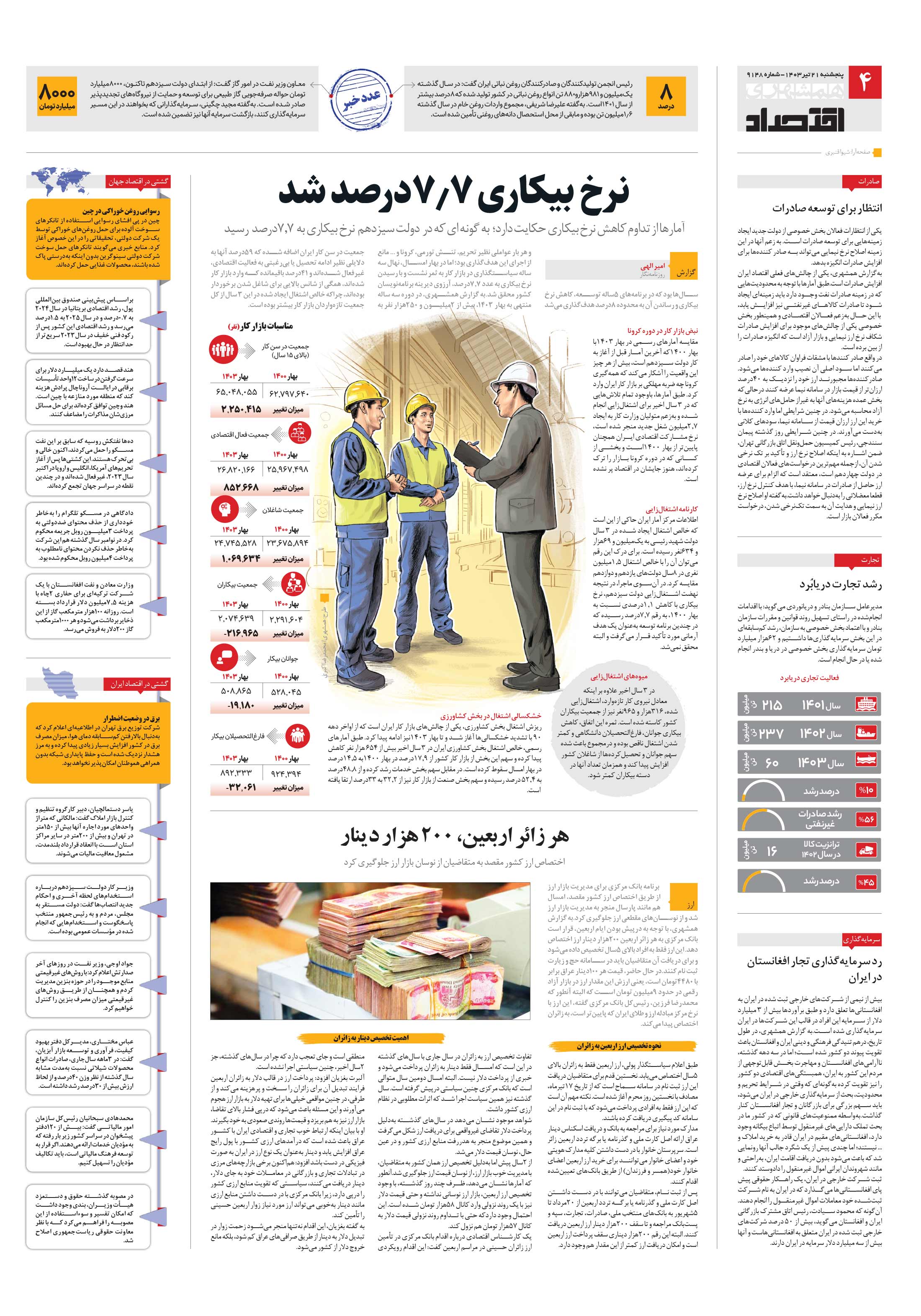 آمارها از تداوم کاهش نرخ بیکاری حکایت دارد؛ به گونه ای که در دولت سیزدهم نرخ بیکاری به 7.7درصد رسید