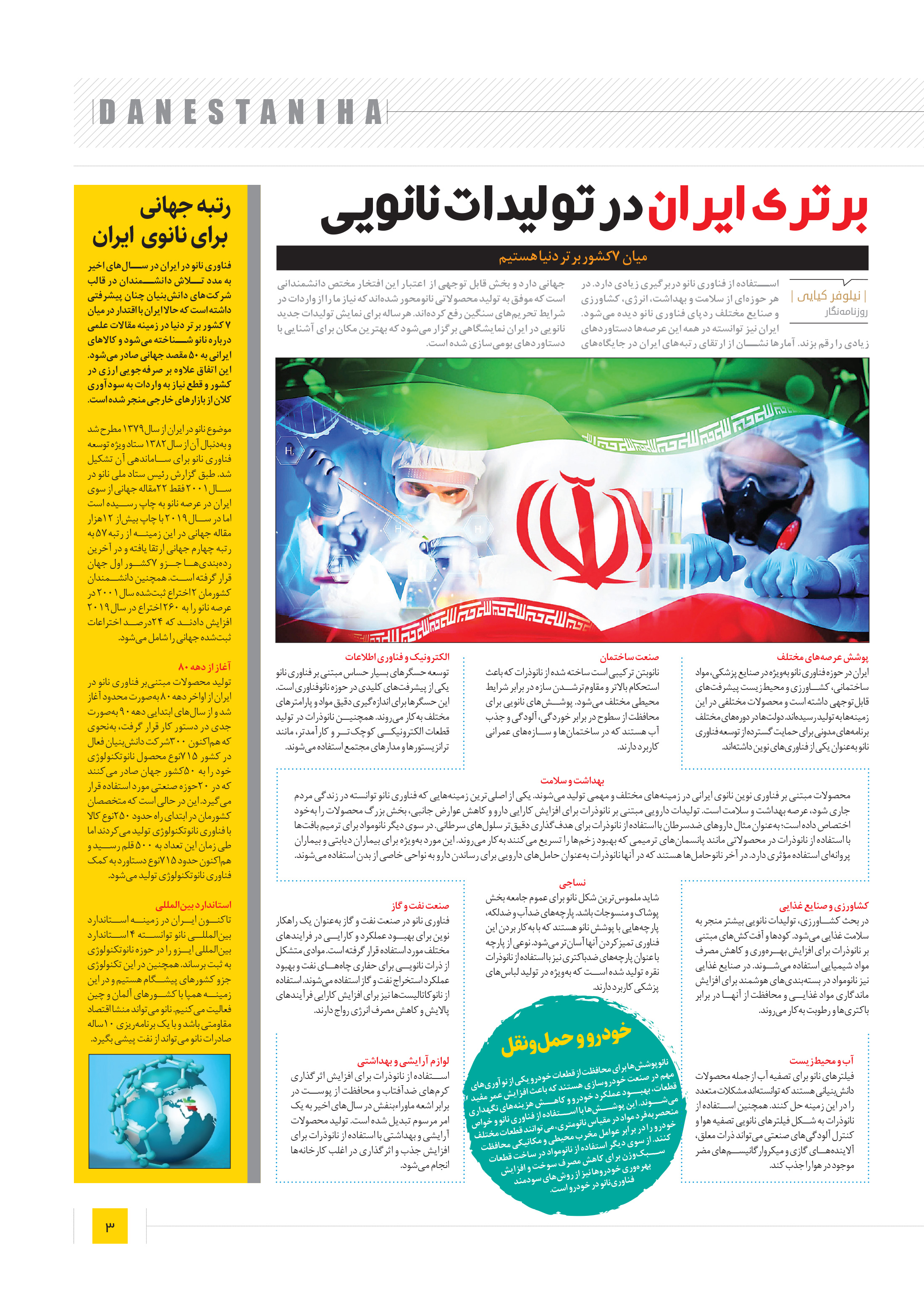 فناوری نانو در ایران در سالهای اخیر به مدد تلاش دانشمندان در قالب شرکتهای دانشبنیان چنان پیشرفتی داشته است که حالا ایران با اقتدار در میان ۷ کشور برتر دنیا در زمینه مقالات علمی درباره نانو شناخته میشود و کالاهای ایرانی به ۵۰ مقصد جهانی صادر میشود.