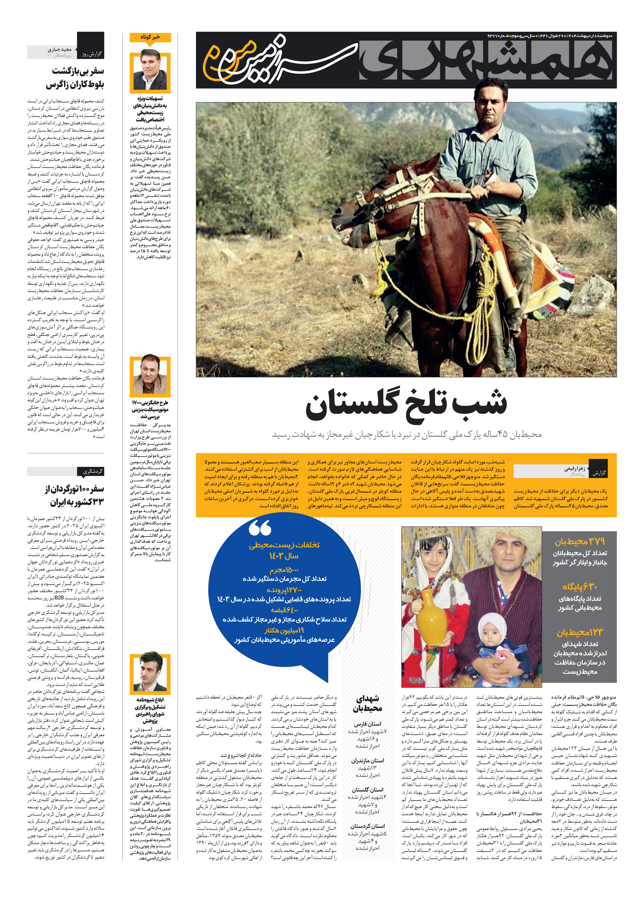یک محیطبان دیگر برای حفاظت از محیطزیست کشور در پارک ملی گلستان شهید شد. کاظم مصدق، محیطبان45ساله پارک ملی گلستان شنبهشب مورد اصابت گلوله شکارچیان قرار گرفت و روز گذشته نیز یک متهم در ارتباط با این جنایت دستگیر شد.