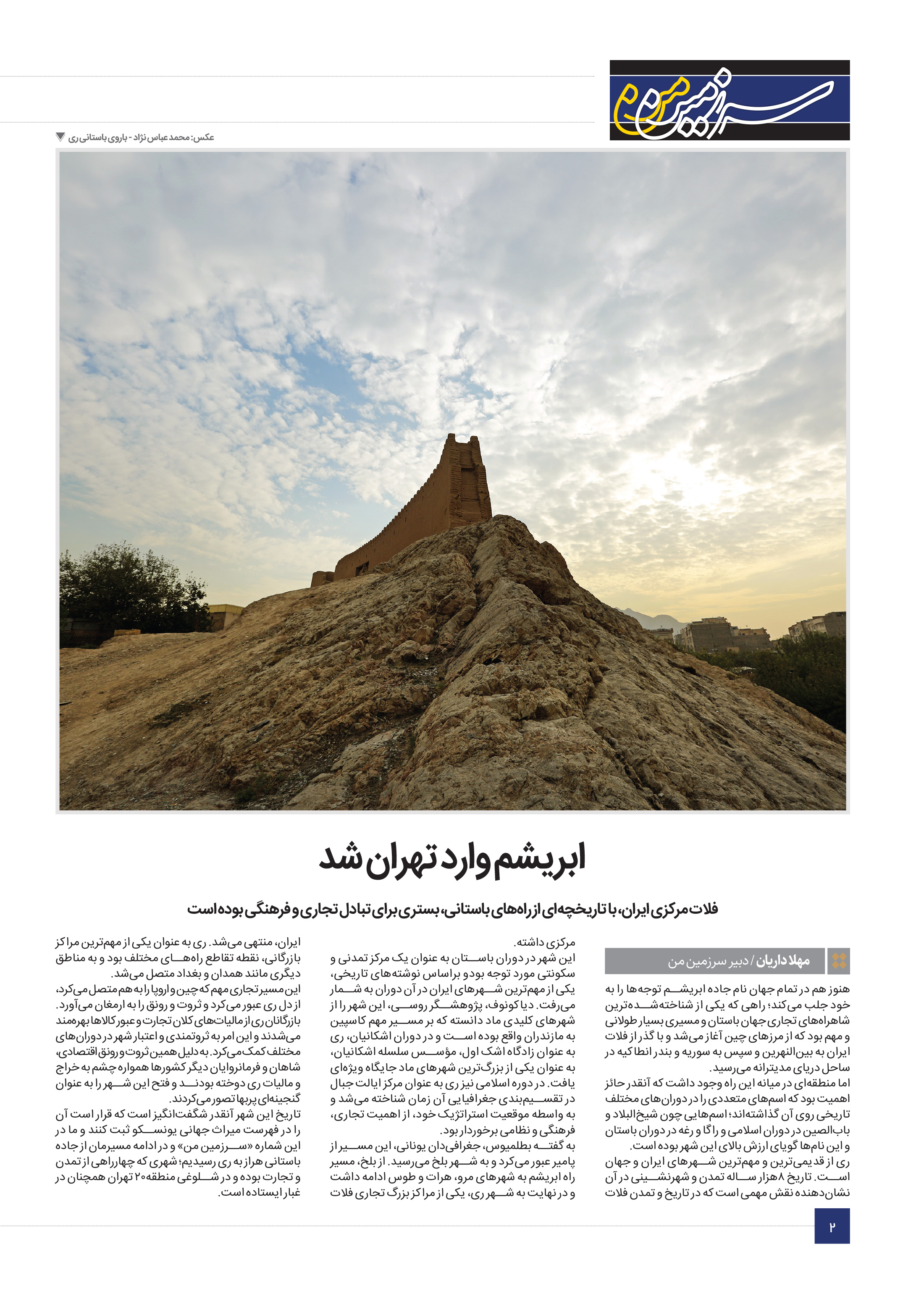 هنوز هم در تمام جهان نام جاده ابریشم توجهها را به خود جلب میکند؛ راهی که یکی از شناختهشدهترین شاهراههای تجاری جهان باستان و مسیری بسیار طولانی و مهم بود که از مرزهای چین آغاز میشد و با گذر از فلات ایران به بینالنهرین و سپس به سوریه و بندر انطاکیه در ساحل دریای مدیترانه میرسید.