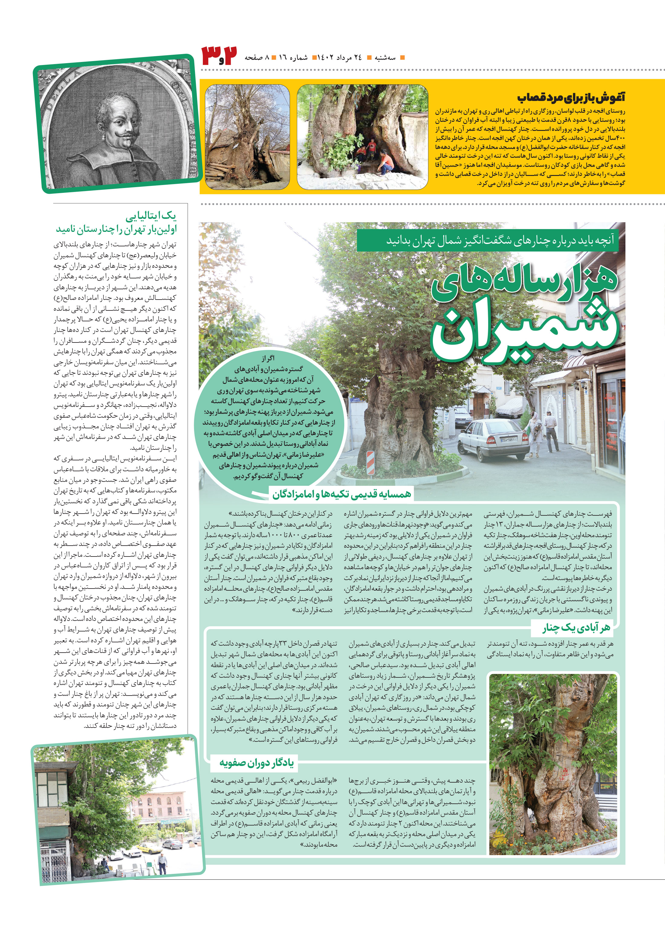 اگر از گستره شمیران و آبادیهای آن که امروز به عنوان محلههای شمال شهر شناخته میشوند به سوی تهران و ری حرکت کنیم، از تعداد چنارهای کهنسال کاسته میشود.