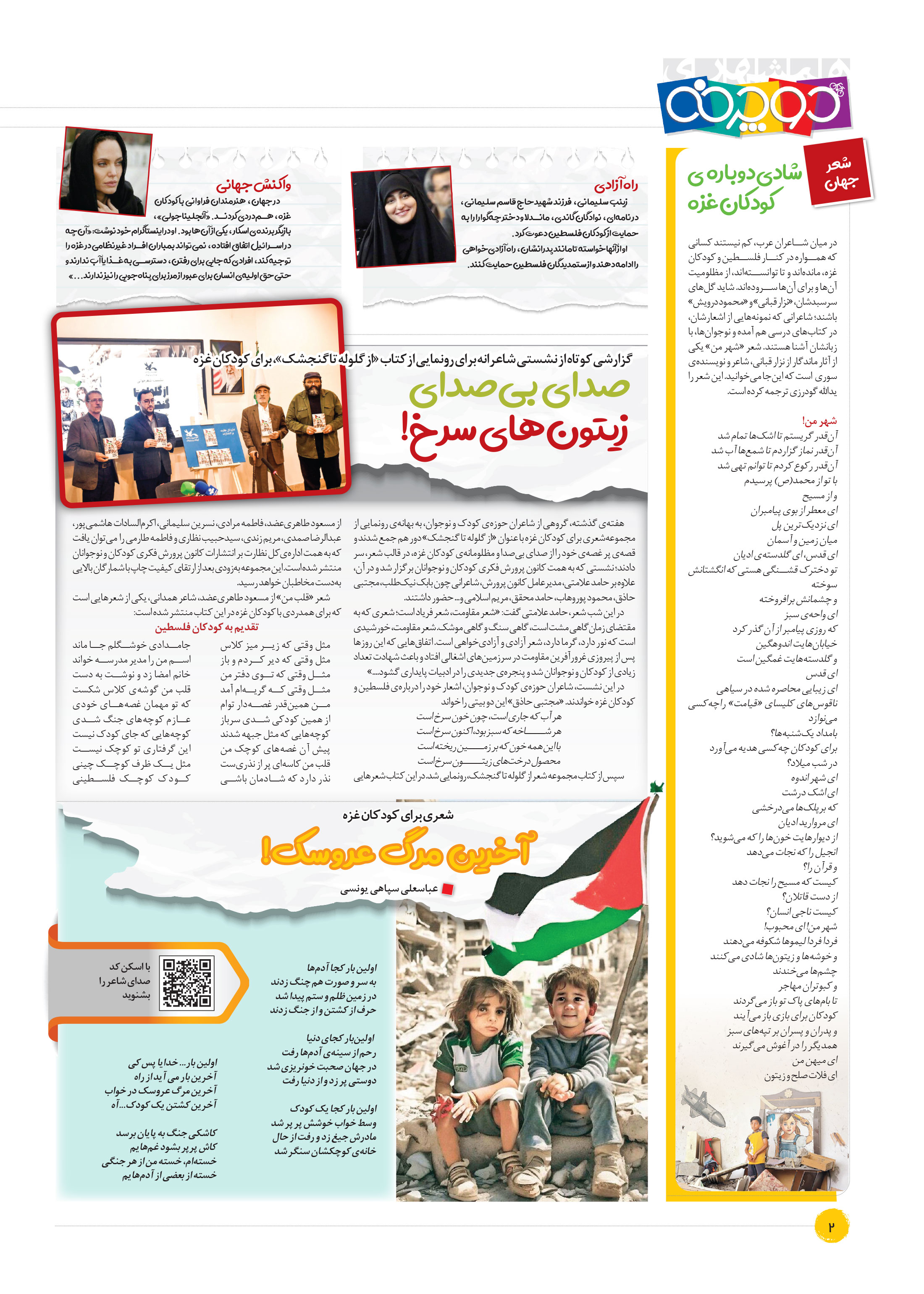 هفتهی گذشته، گروهی از شاعران حوزهی کودک و نوجوان، به بهانهی رونمایی از مجموعهشعری برای کودکان غزه با عنوان «از گلوله تا گنجشک» دور هم جمع شدند و قصهی پر غصهی خود را از صدای بیصدا و مظلومانهی کودکان غزه، در قالب شعر، سر دادند؛ نشستی که به همت کانون پرورش فکری کودکان و نوجوانان برگزار شد .