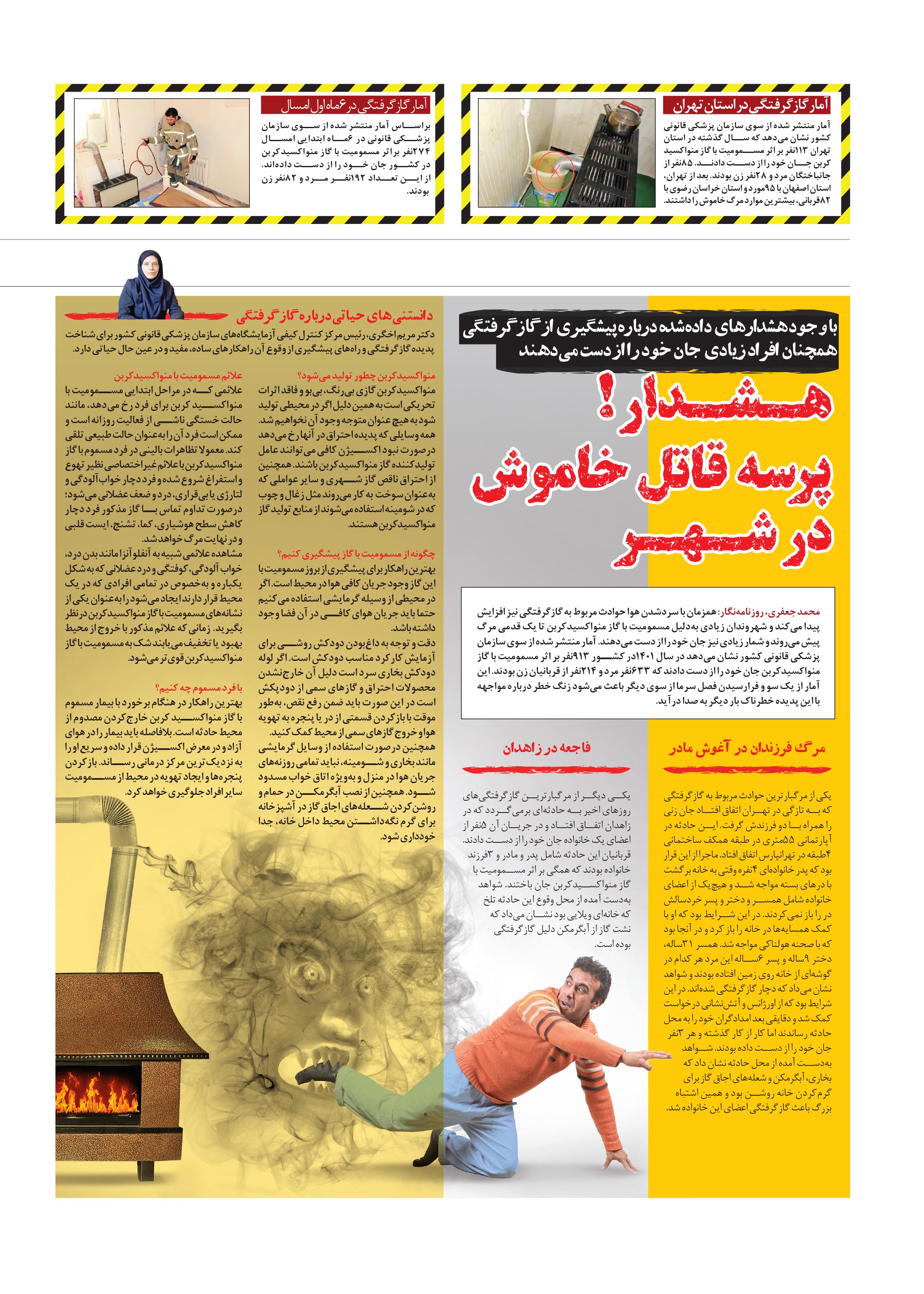 محمد جعفری، روزنامهنگار: همزمان با سردشدن هوا حوادث مربوط به گازگرفتگی نیز افزایش پیدا میکند و شهروندان زیادی بهدلیل مسمومیت با گاز منواکسیدکربن تا یک قدمی مرگ پیش میروند و شمار زیادی نیز جان خود را از دست میدهند.