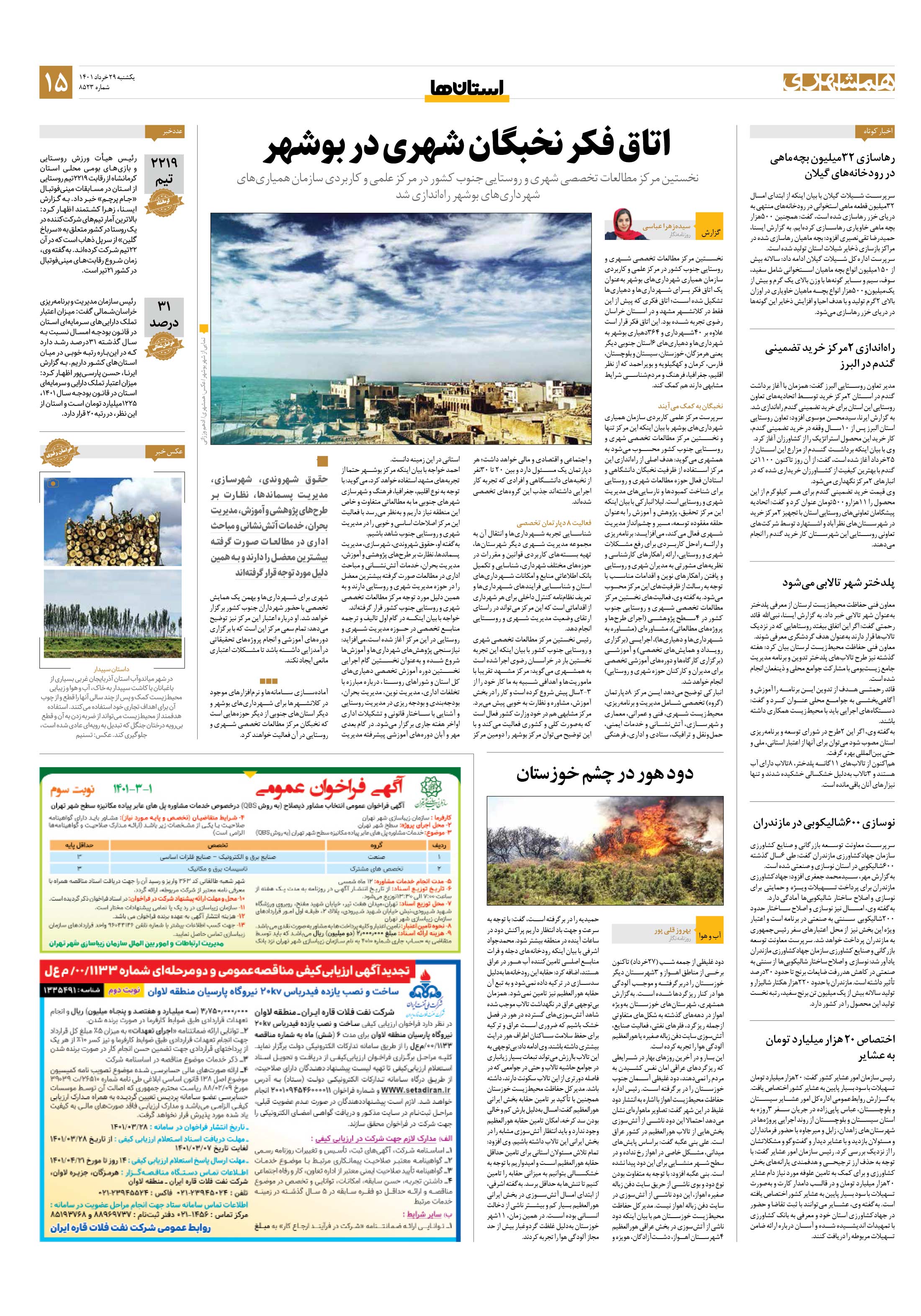 نخستین مرکز مطالعات تخصصی شهری و روستایی جنوب کشور در مرکز علمی و کاربردی سازمان همیاری شهرداریهای بوشهر بهعنوان یک اتاق فکر برای شهرداریها و دهیاریها تشکیل شده است؛ اتاق فکری که پیش از این فقط در کلانشهر مشهد و در استان خراسان رضوی تجربه شده بود.
