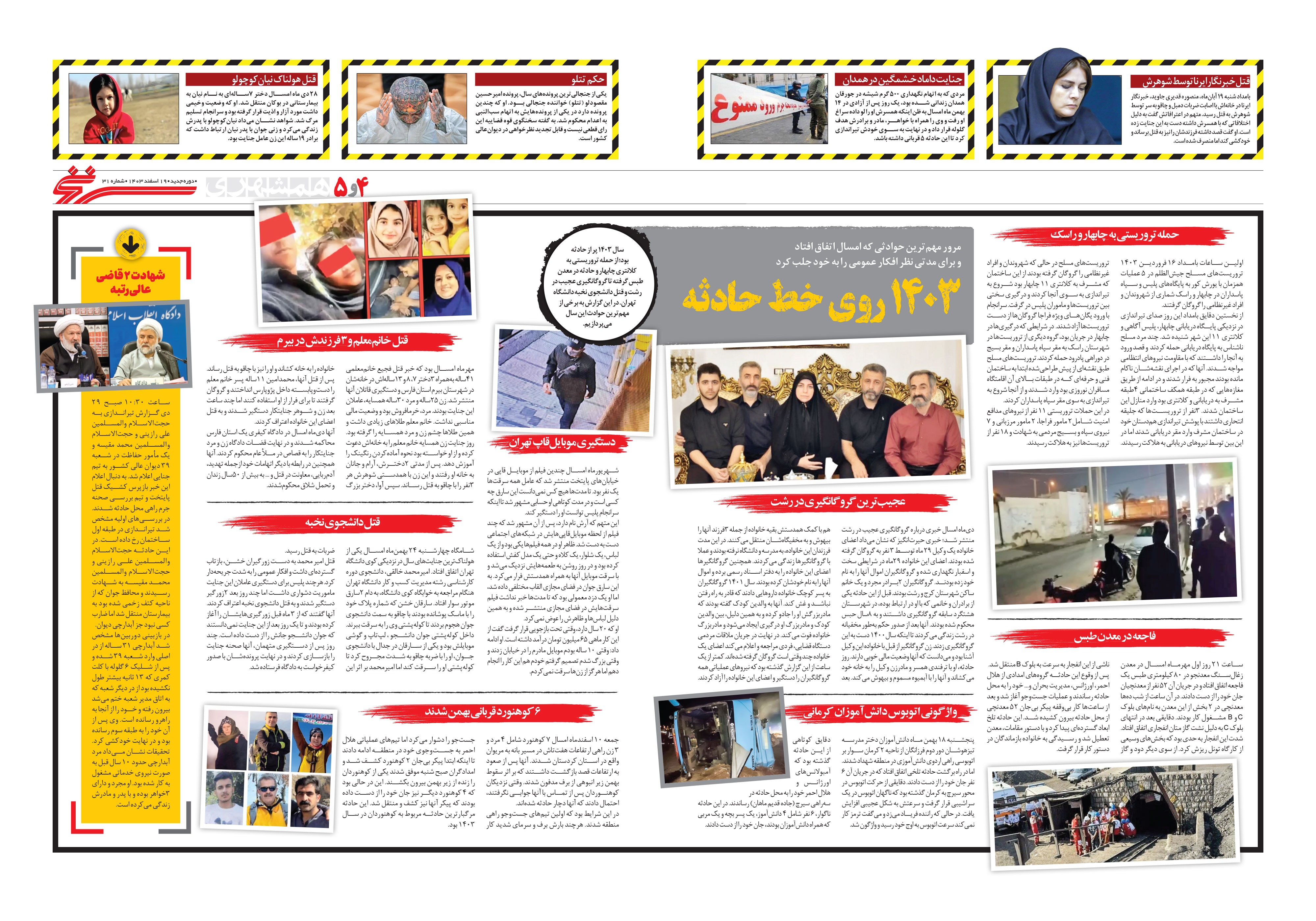 سال 1403 پر از حادثه بود؛ از حمله تروریستی به کلانتری چابهار و حادثه در معدن طبس گرفته تا گروگانگیری عجیب در رشت و قتل دانشجوی نخبه دانشگاه تهران.