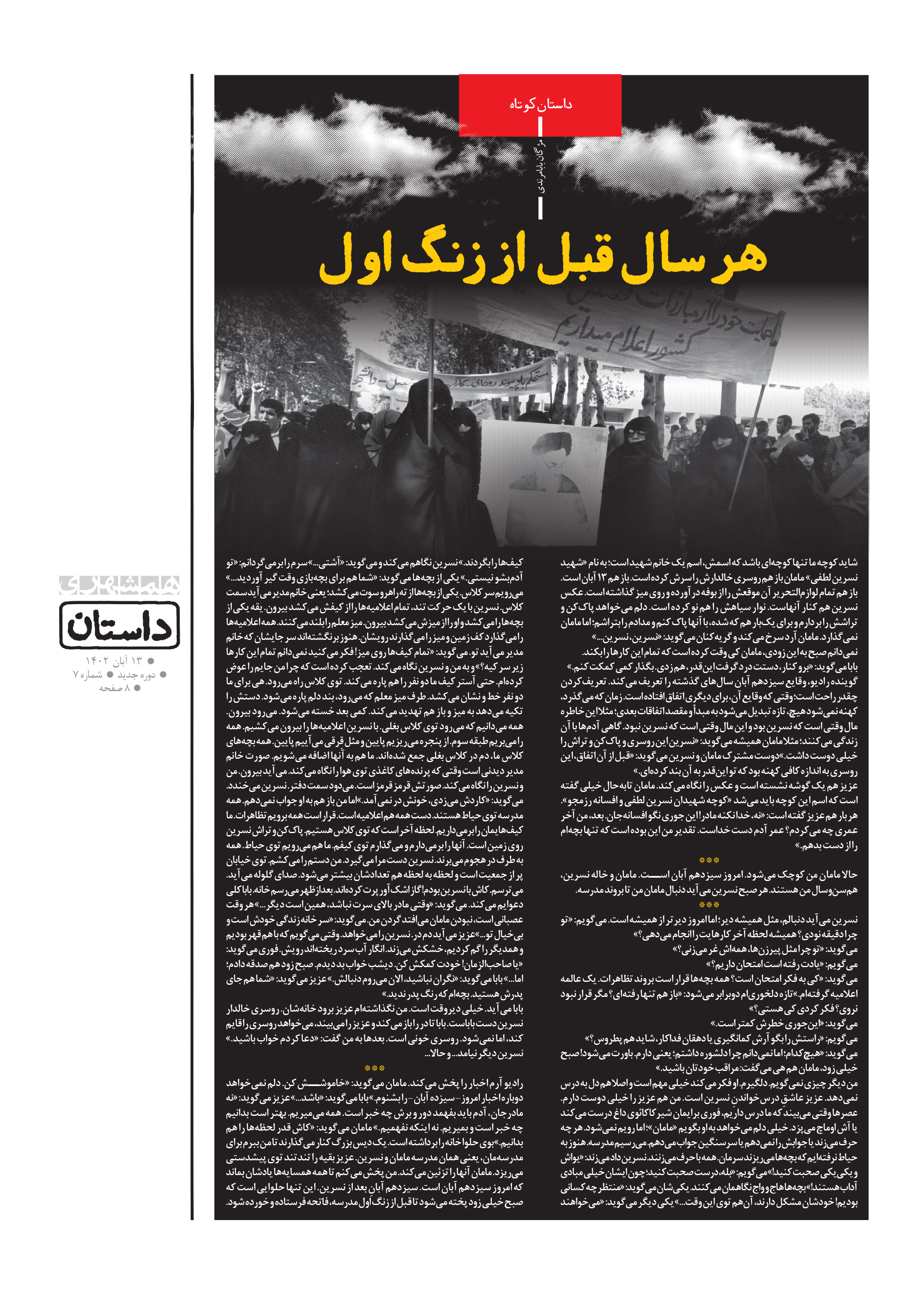 شاید کوچه ما تنها کوچهای باشد که اسمش، اسم یک خانم شهید است؛ به نام «شهید نسرین لطفی» مامان باز هم روسری خالدارش را سرش کرده است.
