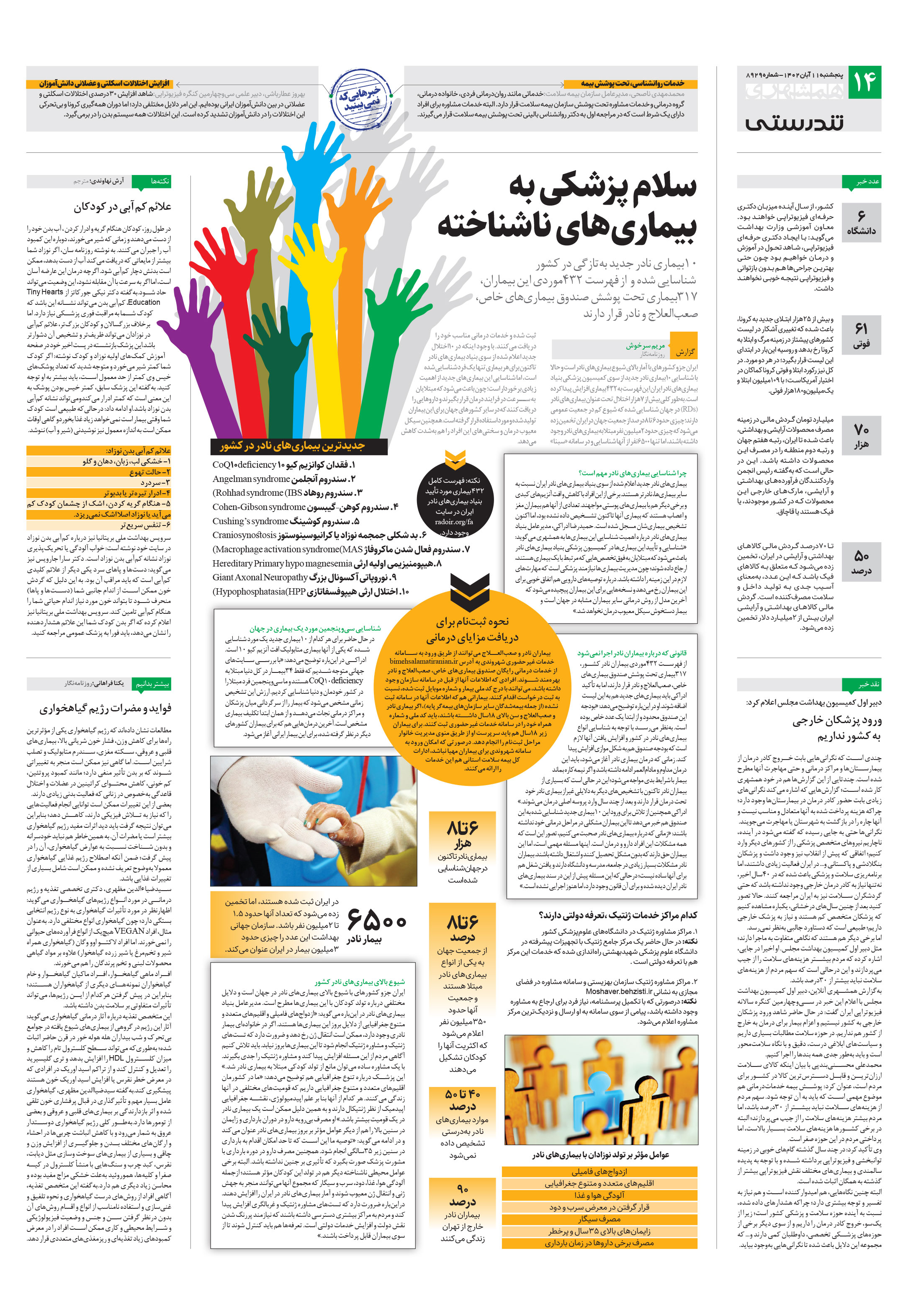 ۱۰بیماری نادر جدید بهتازگی در کشور شناسایی شده و از فهرست 234موردی این بیماران، 7۱3بیماری تحت پوشش صندوق بیماریهای خاص، صعبالعلاج و نادر قرار دارند