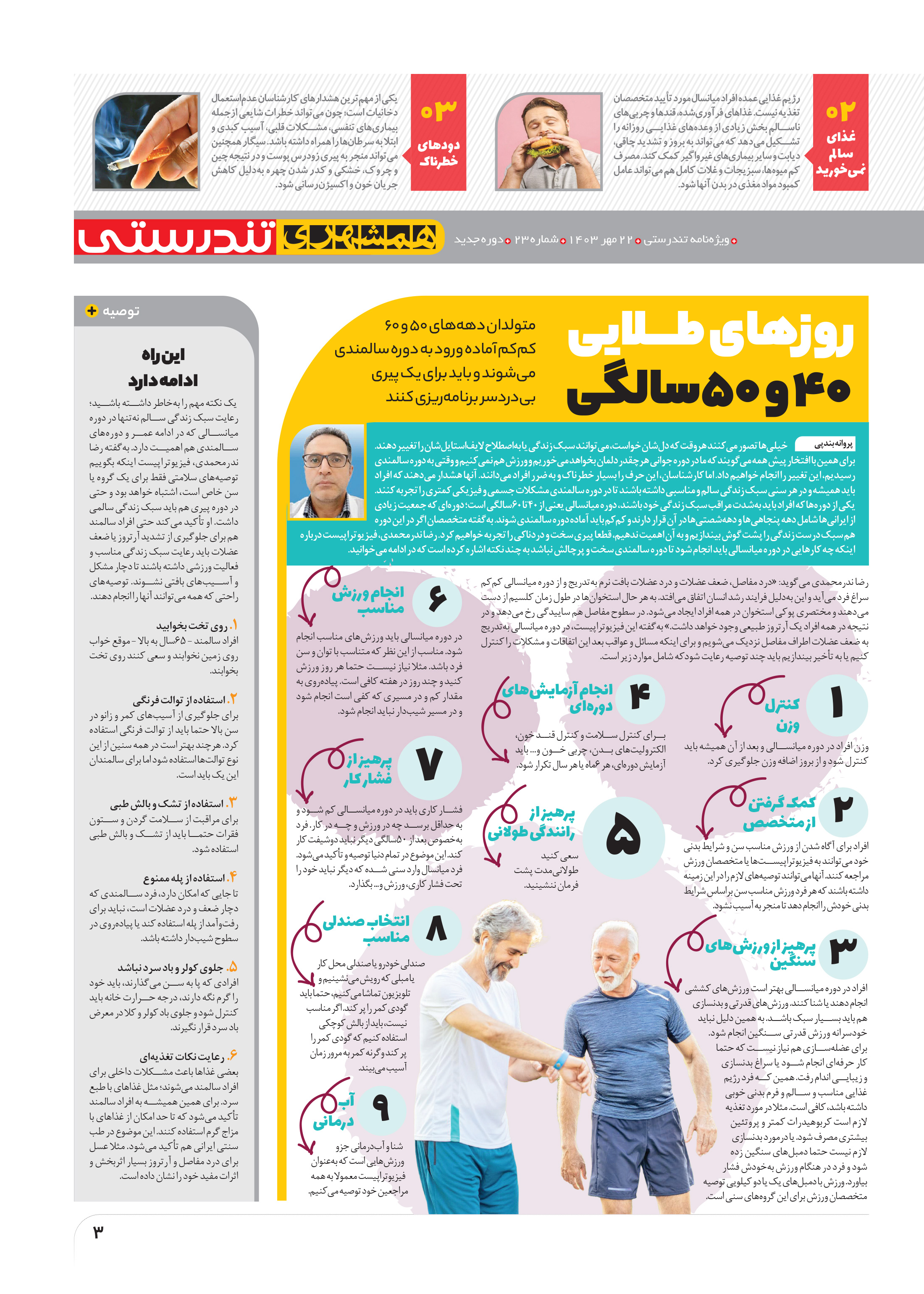 یک نکته مهم را بهخاطر داشته باشید؛ رعایت سبک زندگی سالم نهتنها در دوره میانسالی که در ادامه عمر و دورههای سالمندی هم اهمیت دارد.