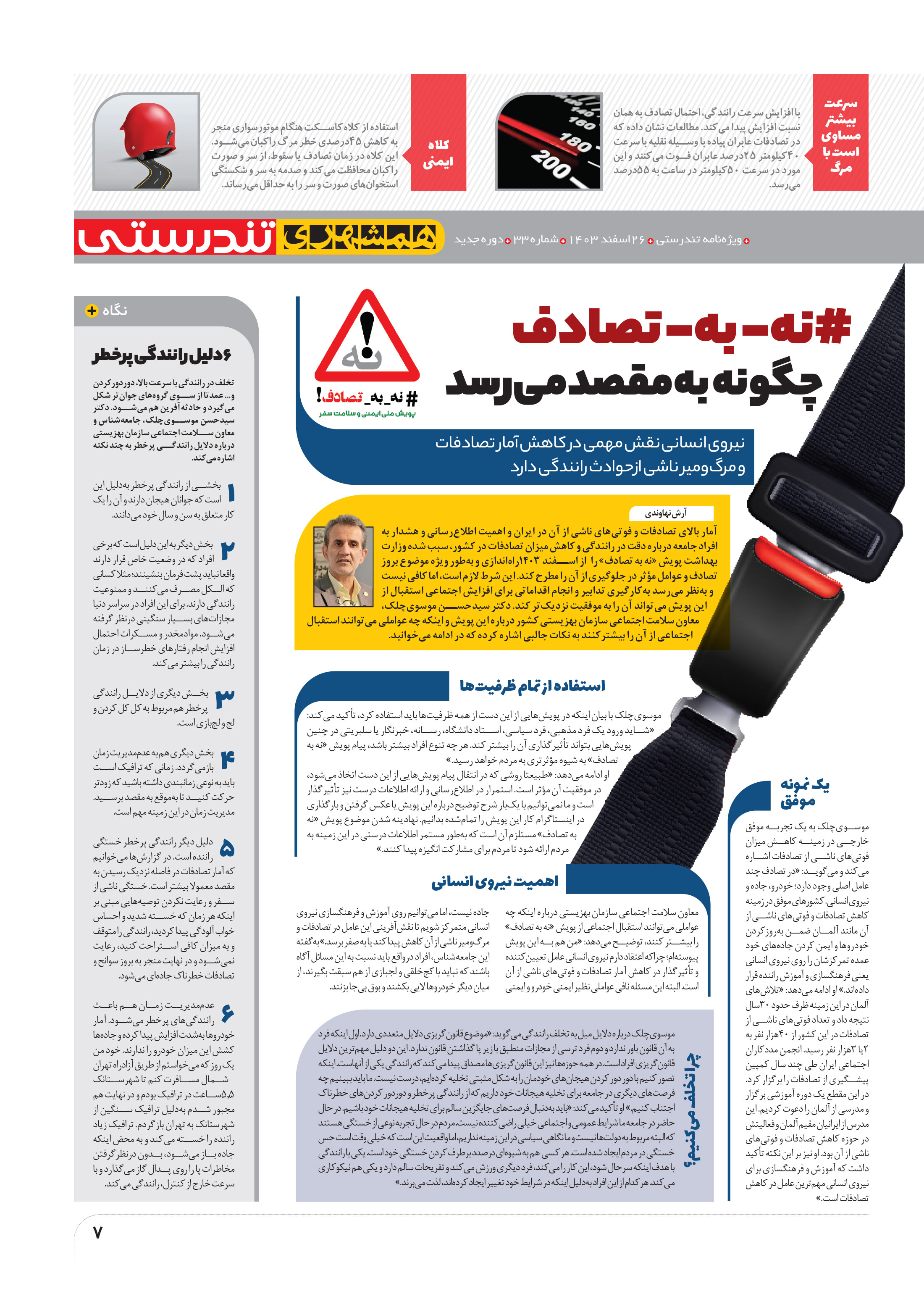 آمار بالای تصادفات و فوتیهای ناشی از آن در ایران و اهمیت اطلاعرسانی و هشدار به افراد جامعه درباره دقت در رانندگی و کاهش میزان تصادفات در کشور، سبب شده وزارت بهداشت پویش «نه به تصادف» را از اسفند 1403راهاندازی و بهطور ویژه موضوع بروز تصادف و عوامل مؤثر در جلوگیری از آن را مطرح کند.