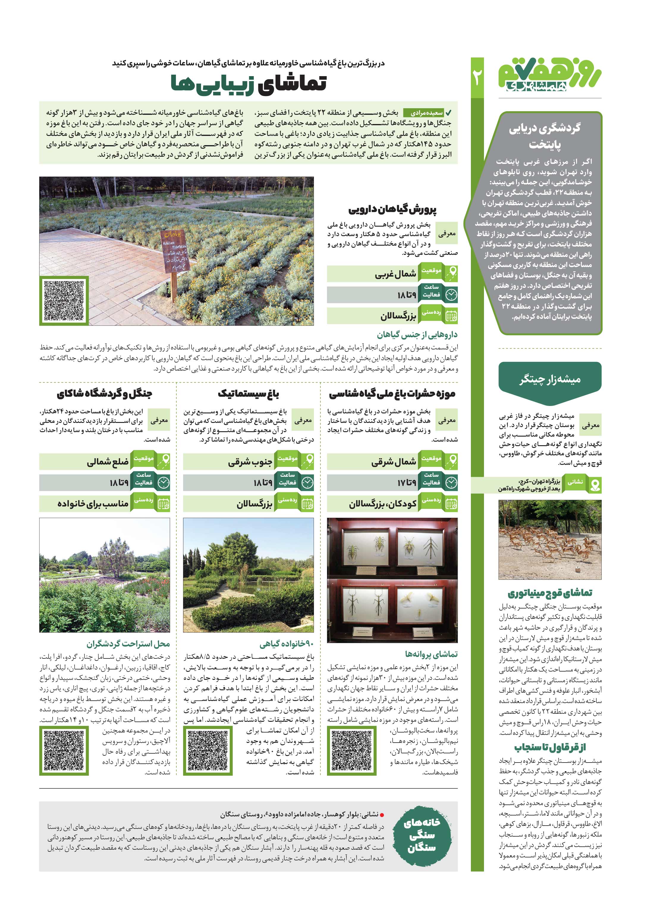 بخش وسیعی از منطقه 22 پایتخت را فضای سبز، جنگلها و رویشگاهها تشکیل داده است. بین همه جاذبههای طبیعی این منطقه، باغ ملی گیاهشناسی جذابیت زیادی دارد.