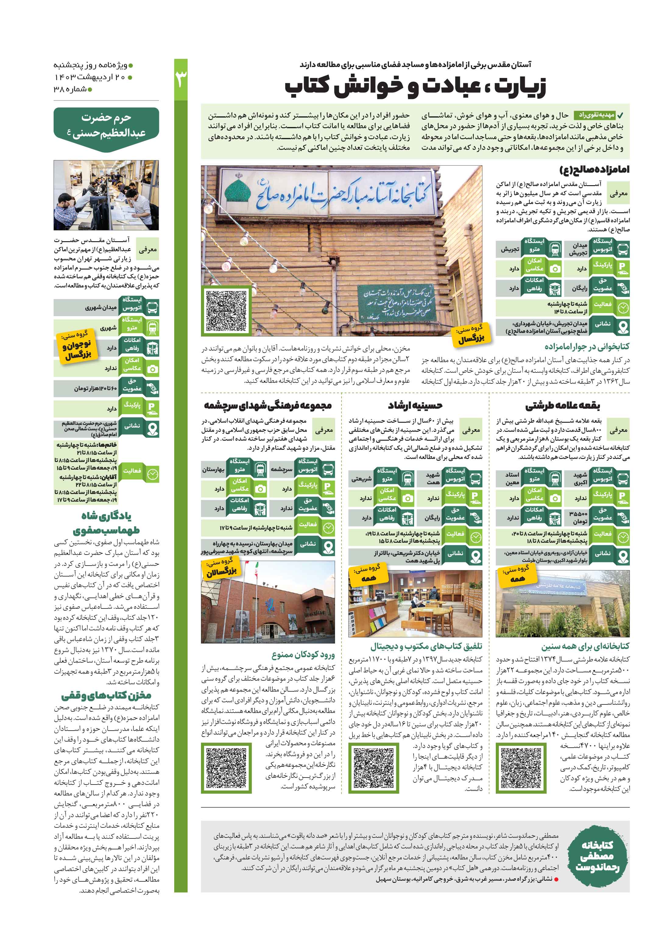 حال و هوای معنوی، آب و هوای خوش، تماشای بناهای خاص و لذت خرید، تجربه بسیاری از آدمها از حضور در محلهای خاص مذهبی مانند امامزادهها، بقعهها و حتی مساجد است اما در محوطه و داخل برخی از این مجموعهها، امکاناتی وجود دارد که میتواند مدت حضور افراد را در این مکانها را بیشتر کند و نمونهاش هم داشتن فضاهایی برای مطالعه یا امانت کتاب است.