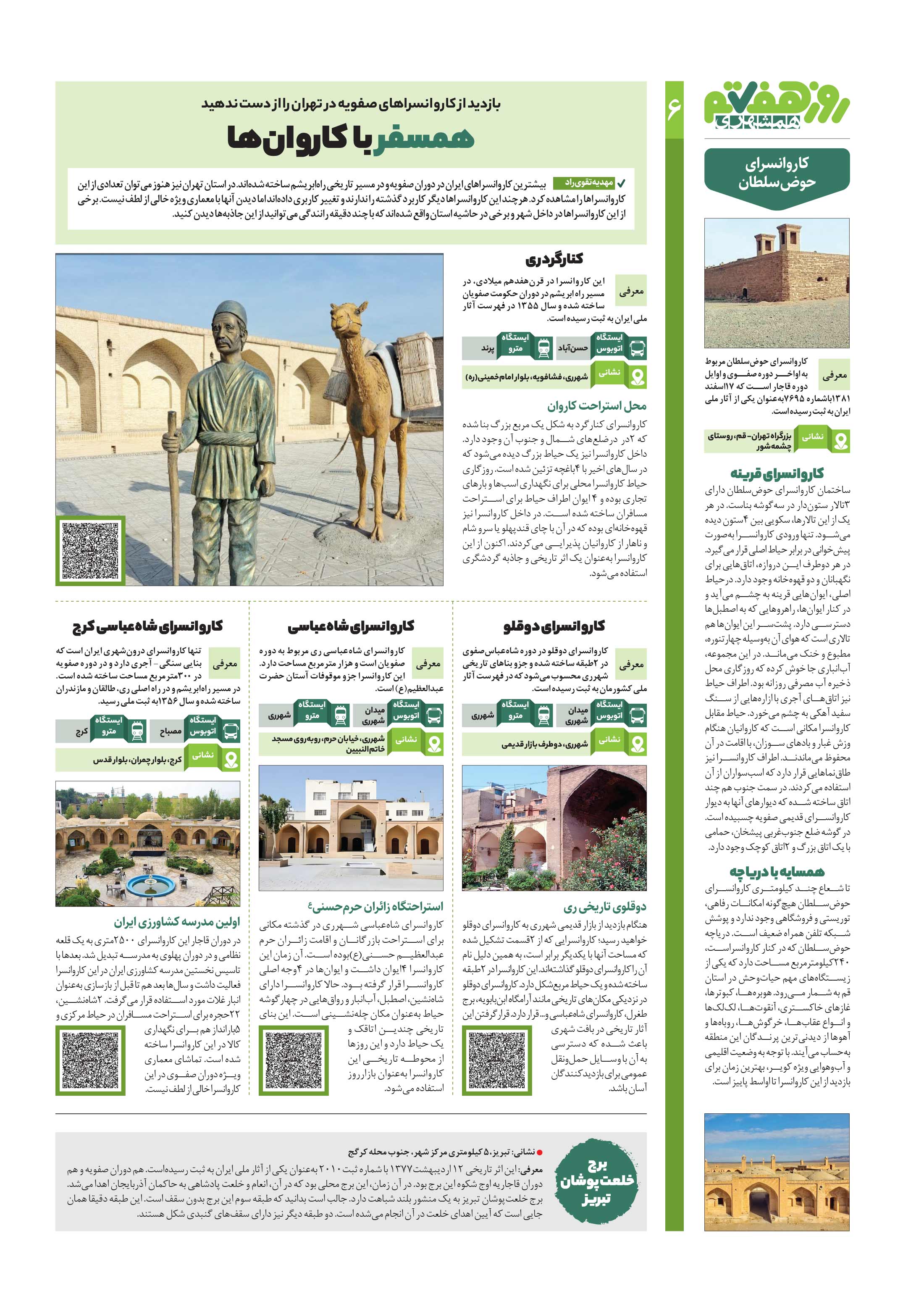 بیشترین کاروانسراهای ایران در دوران صفویه و در مسیر تاریخی راهابریشم ساخته شدهاند. در استان تهران نیز هنوز میتوان تعدادی از این کاروانسراها را مشاهده کرد.