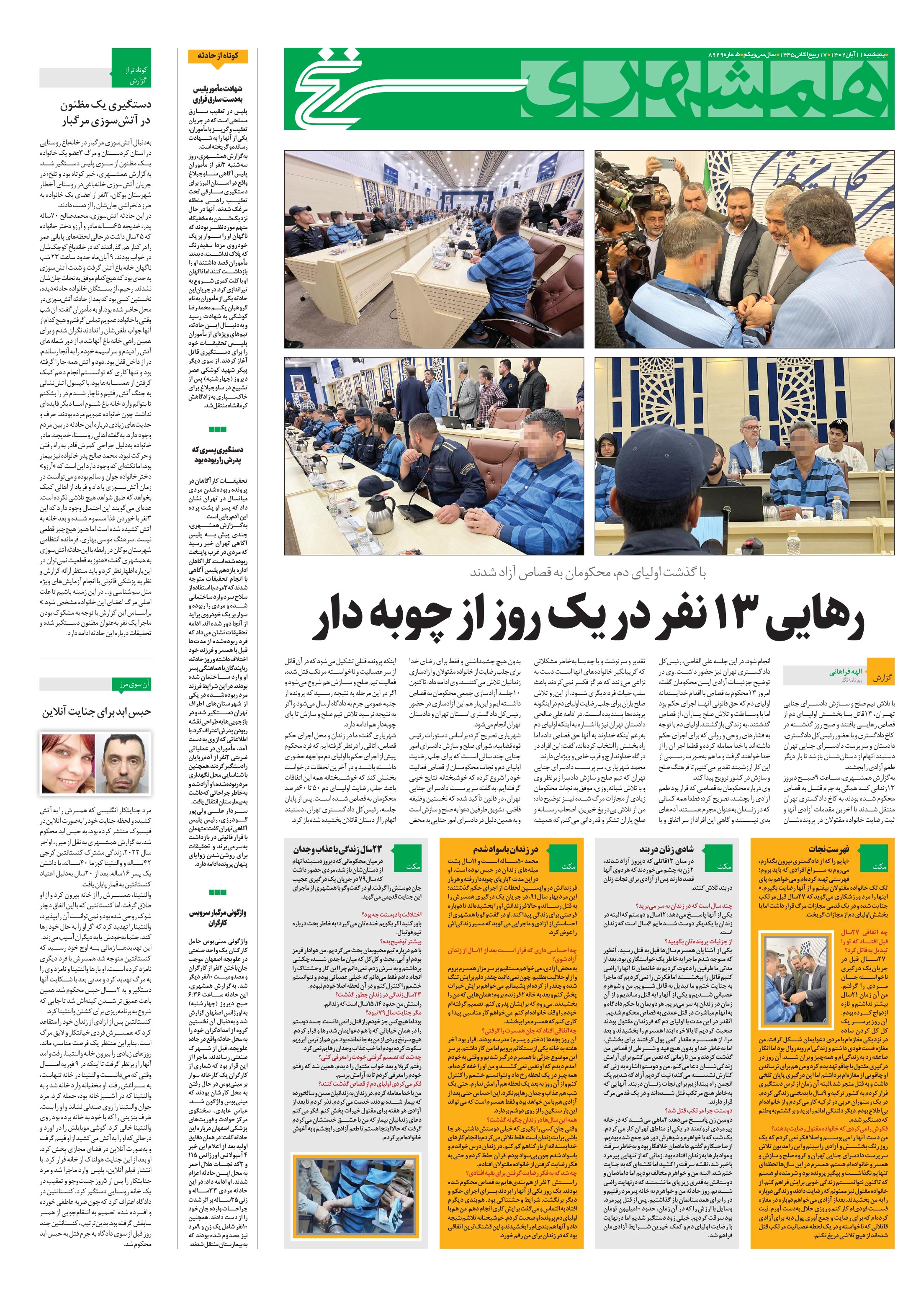 با تلاش تیم صلح و سازش دادسرای جنایی تهران، 13قاتل با بخشش اولیای دم از قصاص رهایی یافتند و صبح روز گذشته در کاخ دادگستری و با حضور رئیسکل دادگستری، دادستان و سرپرست دادسرای جنایی تهران دستبند اتهام از دستانشان بازشد تا بار دیگر طعم آزادی را بچشند.