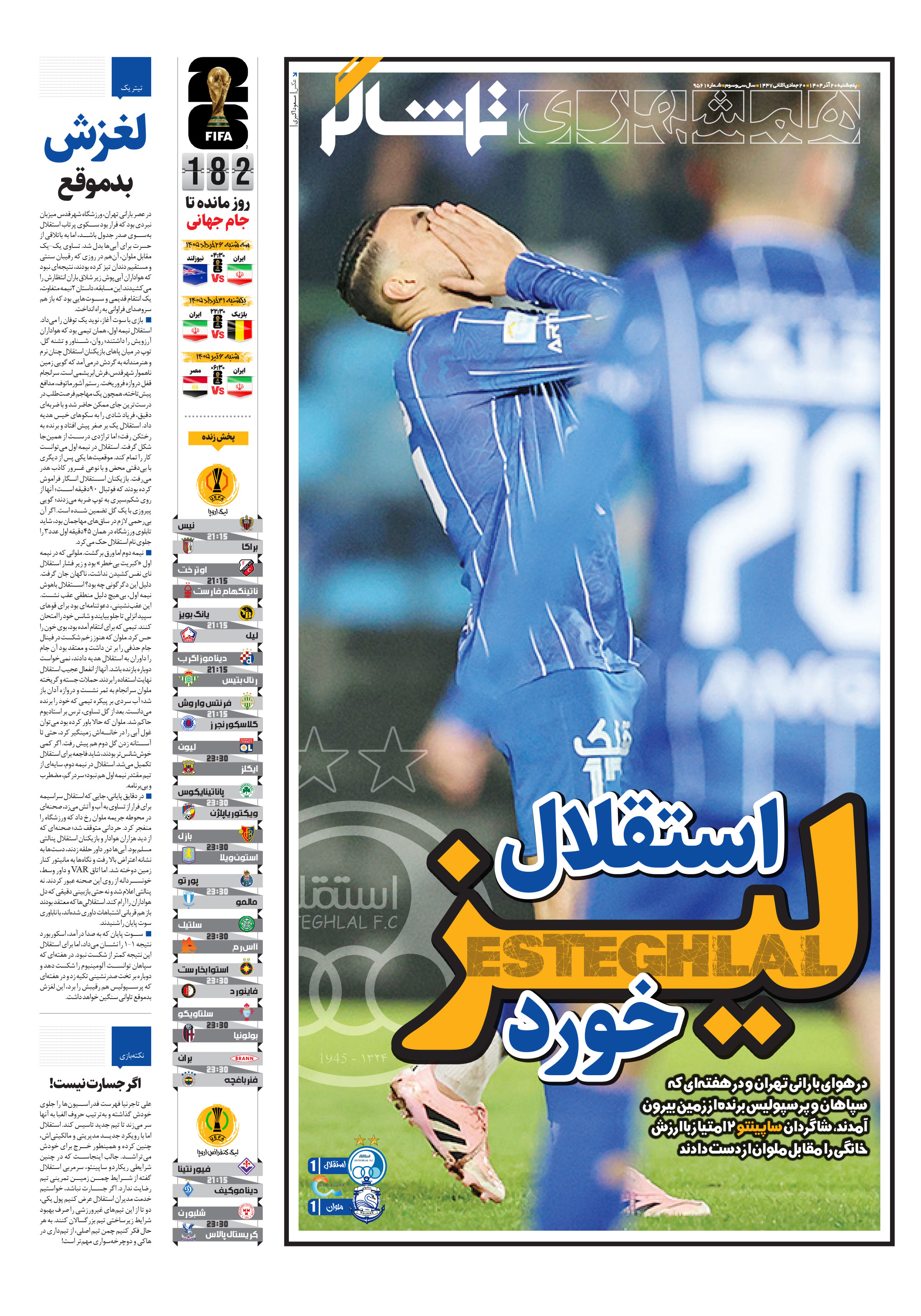در هواي باراني تهران و در هفتهاي که سپاهان و پرسپوليس برنده از زمين بيرون آمدند، شاگردان ساپينتو 2امتياز باارزش خانگي را مقابل ملوان از دست دادند