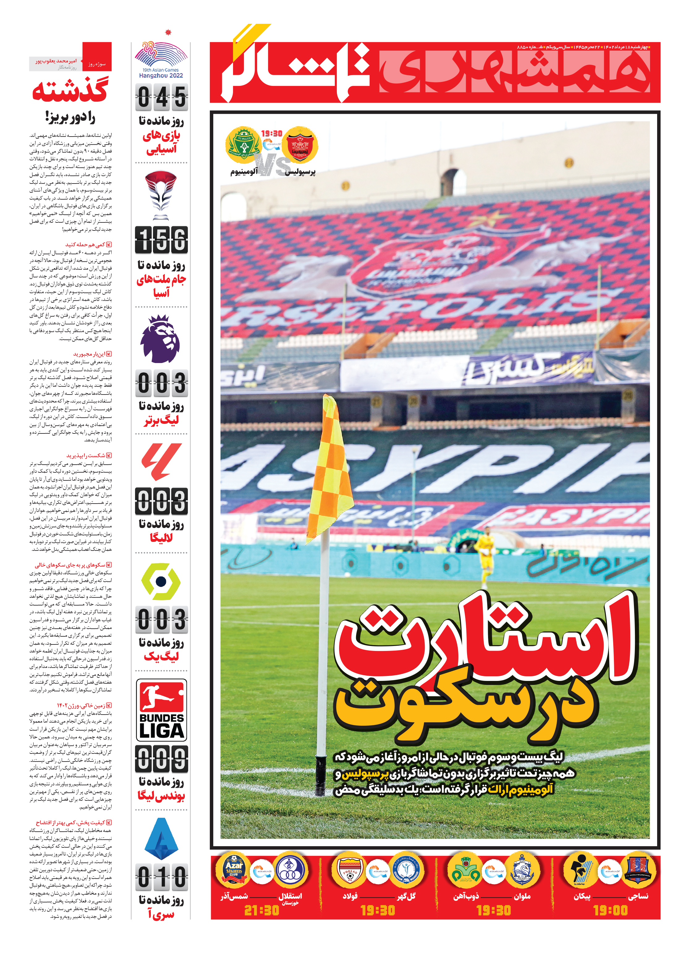 لیگ بیست‌وسوم فوتبال در حالی از امروز آغاز می‌شود که همه چیز تحت تاثیر برگزاری بدون تماشاگر بازی پرسپولیس و آلومینیوم اراک قرار گرفته است؛ یک بدسلیقگی محض