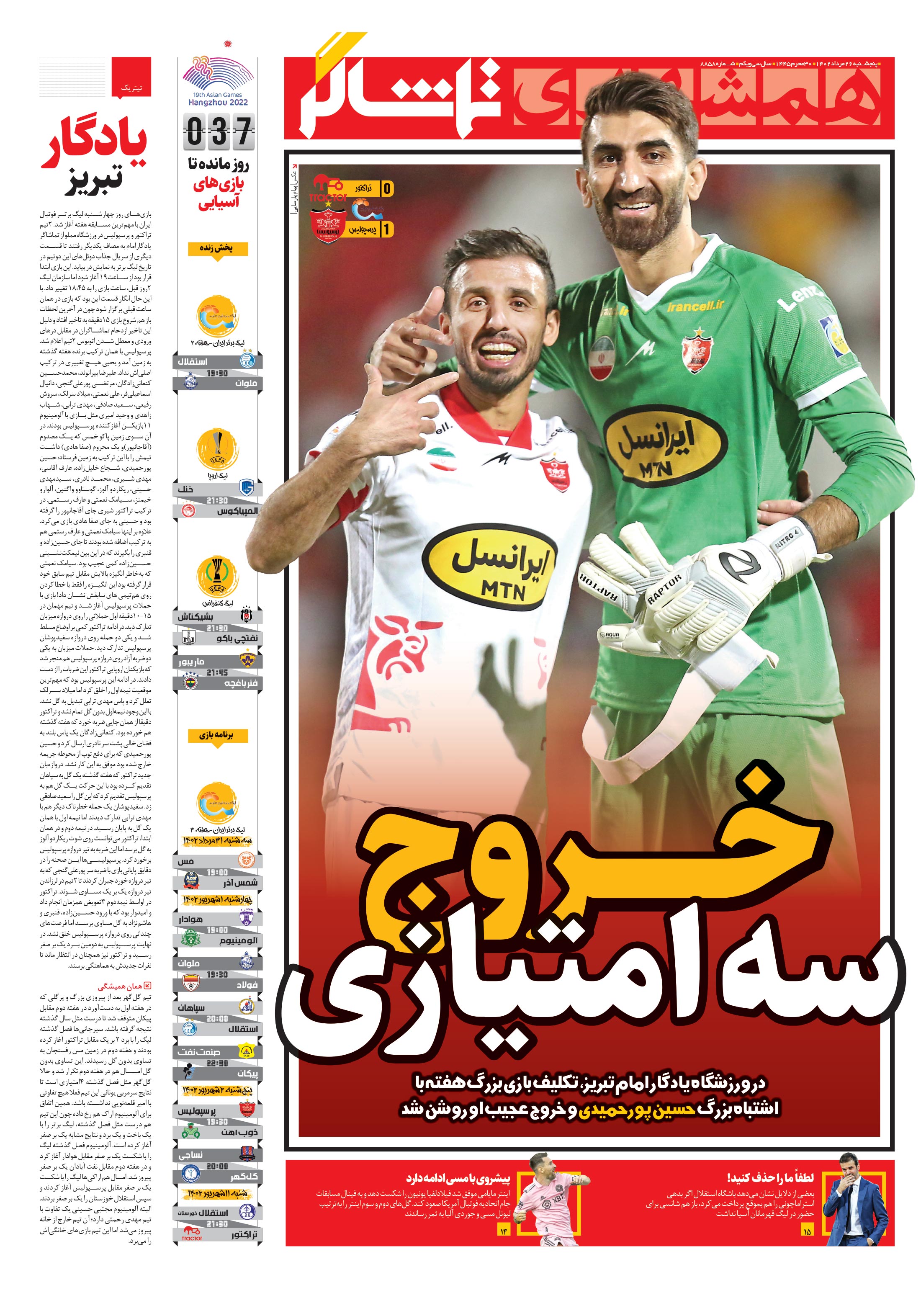بازیهای روز چهارشنبه لیگ برتر فوتبال ایران با مهمترین مسابقه هفته آغاز شد. 2تیم تراکتور و پرسپولیس در ورزشگاه مملو از تماشاگر یادگارامام به مصاف یکدیگر رفتند تا قسمت دیگری از سریال جذاب دوئلهای این دوتیم در تاریخ لیگ برتر به نمایش در بیاید.