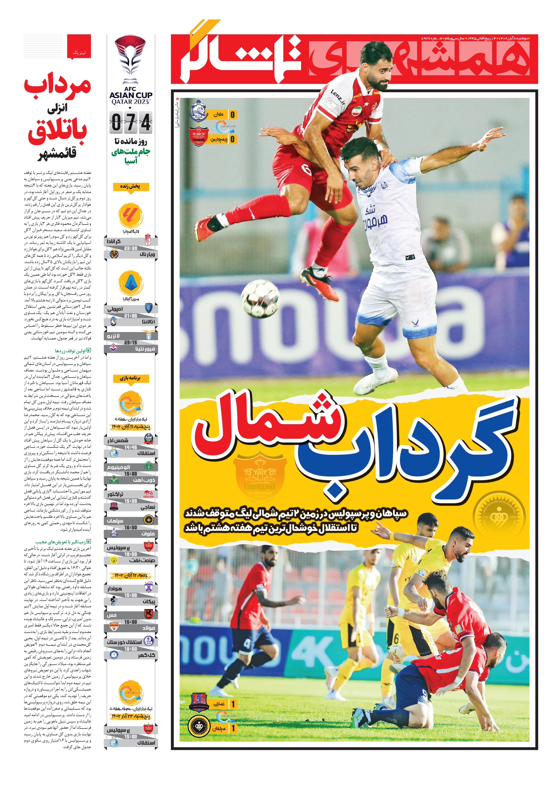 هفته هشتم رقابتهای لیگ برتر با توقف 2تیم مدعی یعنی پرسپولیس و سپاهان به پایان رسید.