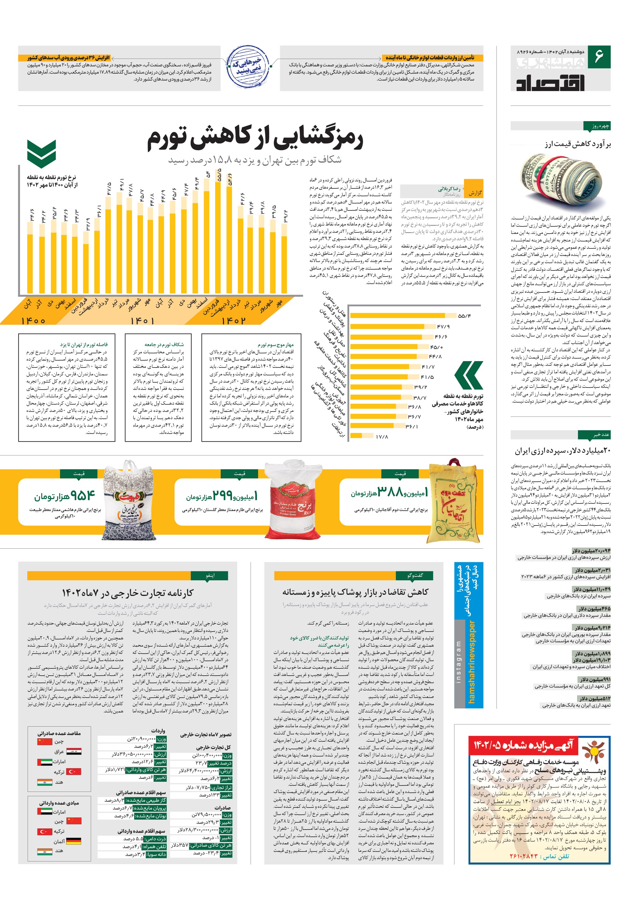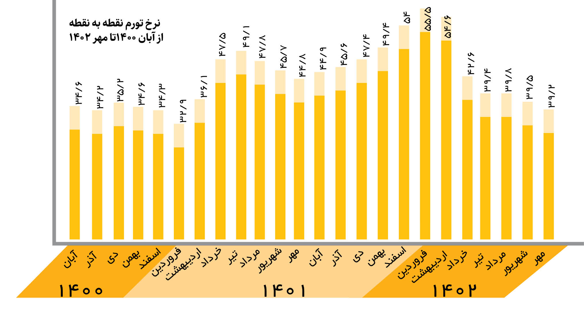 نرخ تورم نقطه به نقطه در مهر سال 1402با کاهش 3دهم درصدی نسبت به شهریور به روایت مرکز آمار ایران به 39.2درصد رسید و پنجمینماه کاهش را تجربه کرد و تا رسیدن به نرخ تورم 30درصدی هدفگذاری دولت تا پایان سال فاصله 9.2واحد درصدی دارد.