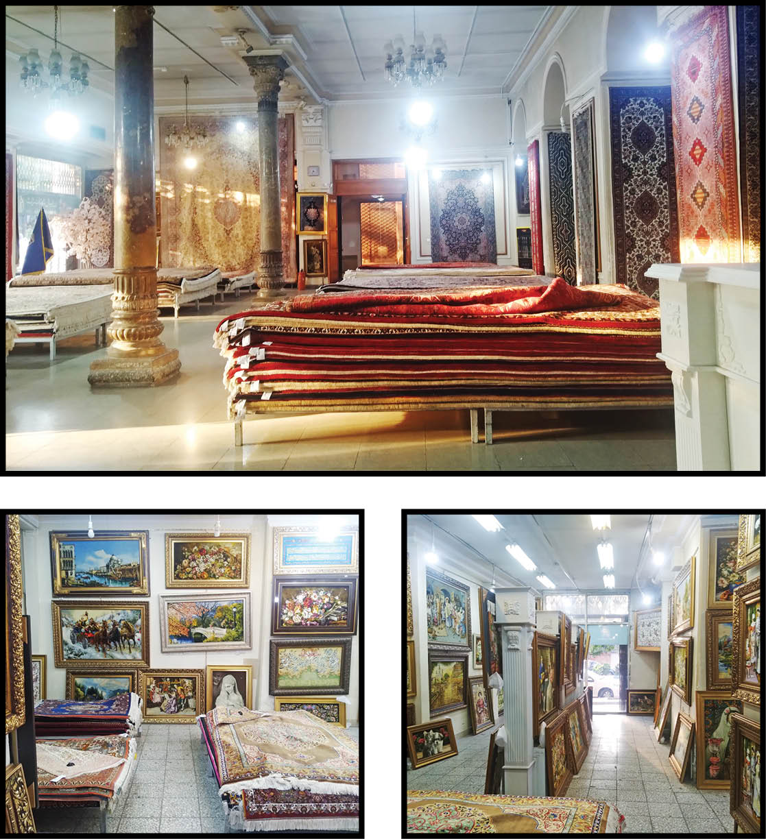 در بافت کیف و کوسن و بشقابهای تزئینی حسابی سلیقه به خرج دادهاند و در نقوش آنها تلفیقی از نقوش سنتی فرشهای دستبافت و طرحهای امروزی فرشهای ماشینی به چشم میخورد، اما در میان تابلوفرشهای گرانقیمت سالن که لابهلای چلههای پشمی آنها چند تار ابریشمی هم تاباندهاند،