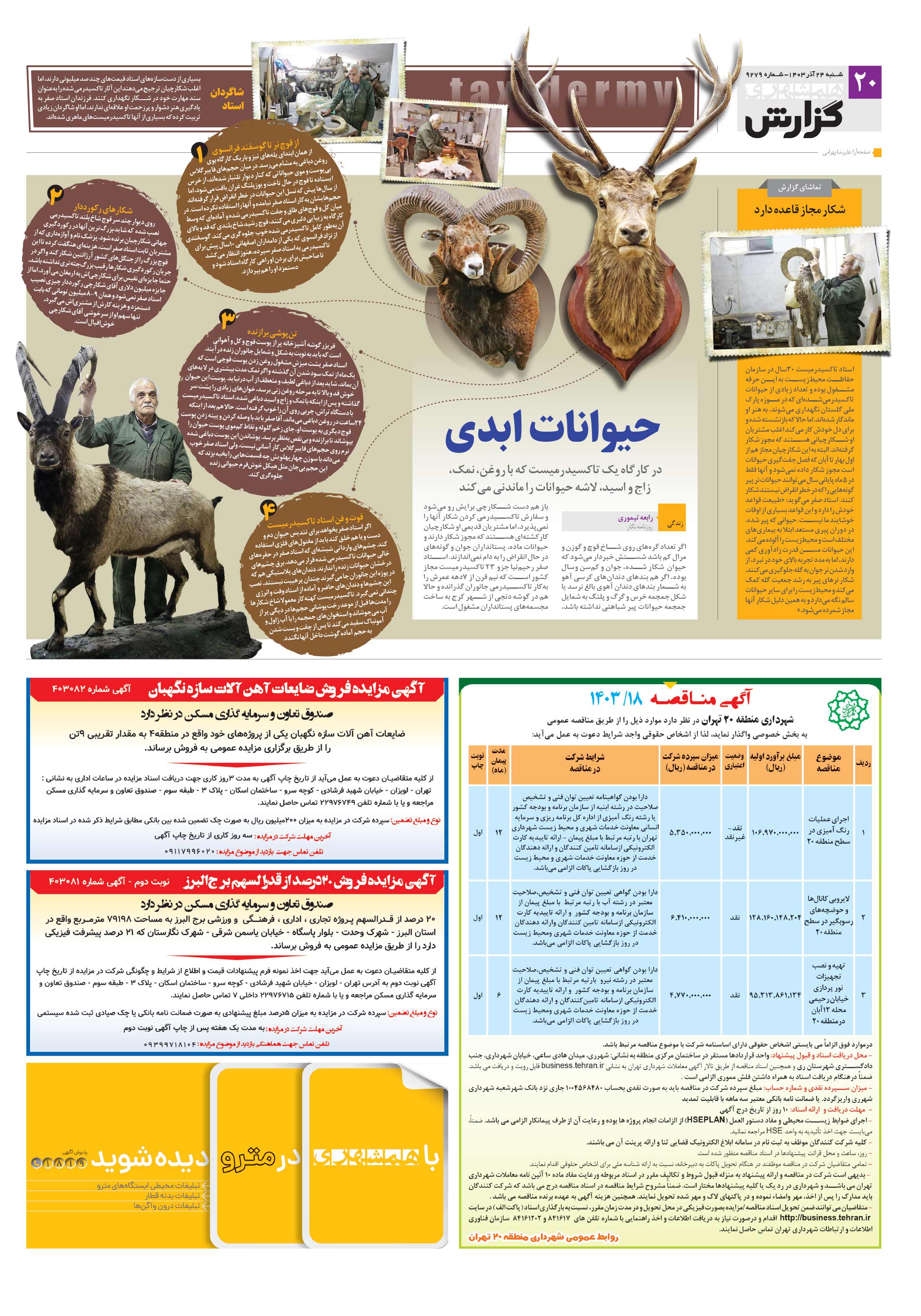 استاد تاکسیدرمیست 30سال در سازمان حفاظت محیطزیست به این حرفه مشغول بوده و تعداد زیادی از حیوانات تاکسیدرمیشدهای که در موزه پارک ملی گلستان نگهداری میشوند، به هنر او ماندگار شدهاند، اما حالا که بازنشسته شده و برای دل خودش کار میکند اغلب مشتریان او شکارچیانی هستند که مجوز شکار گرفتهاند.
