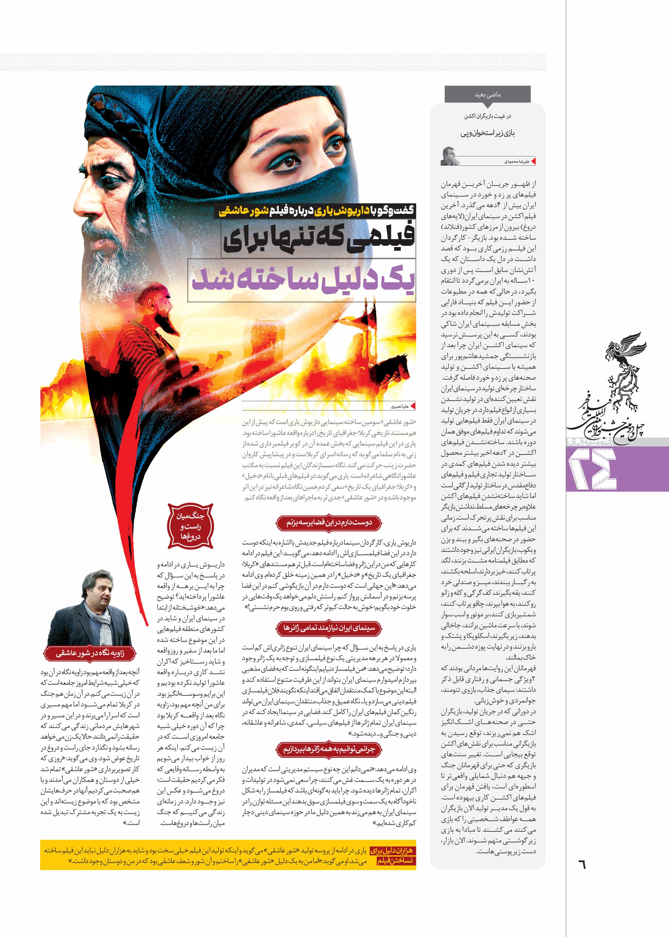 «شور عاشقی» سومین ساخته سینمایی داریوش یاری است که پیش از این هم مستند تاریخی کربلا؛ جغرافیای تاریخ را درباره واقعه عاشورا ساخته بود.