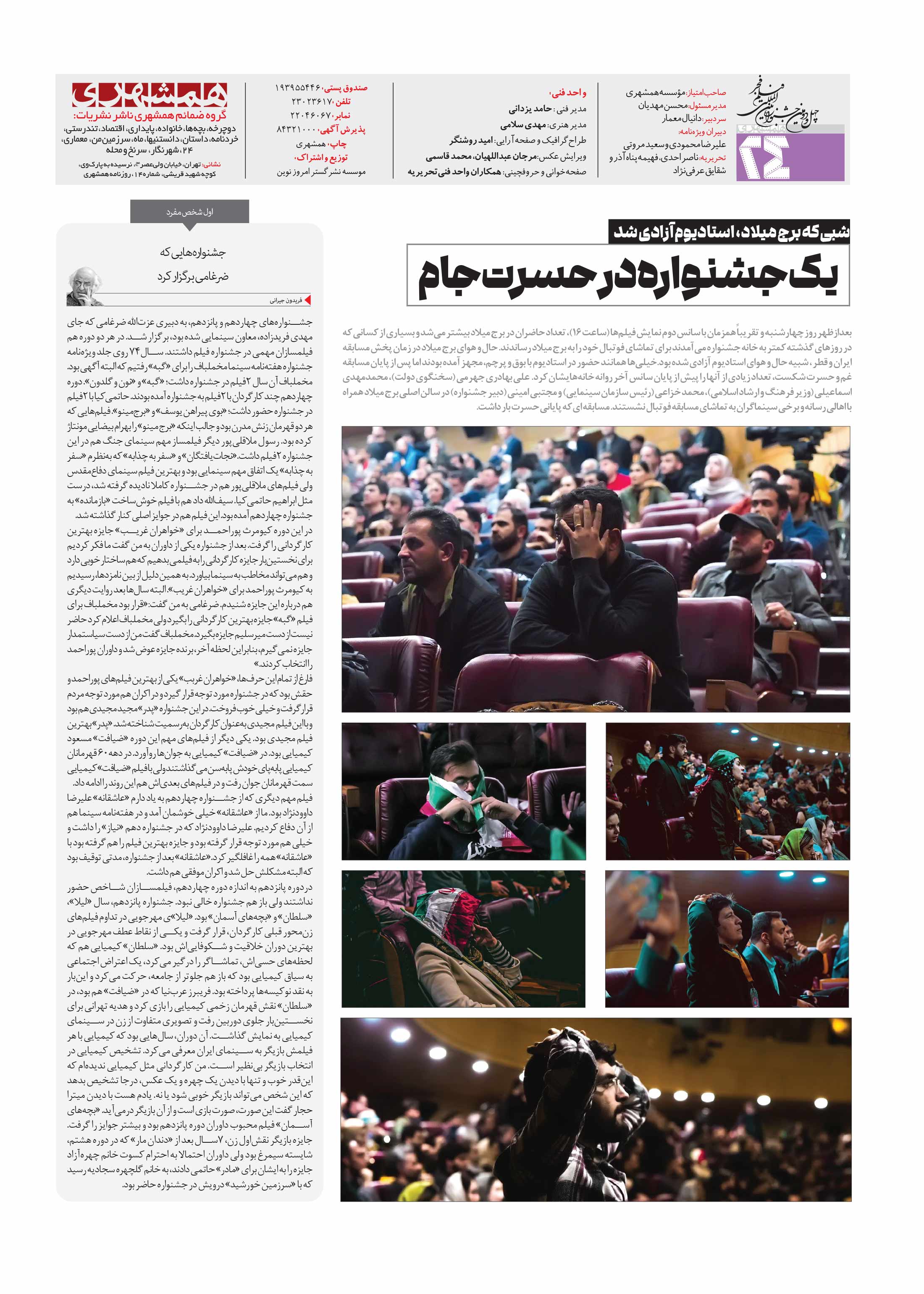 بعدازظهر روز چهارشنبه و تقریباً همزمان با سانس دوم نمایش فیلمها ساعت ۱۶، تعداد حاضران در برج میلاد بیشتر میشد و بسیاری از کسانی که در روزهای گذشته کمتر به خانه جشنواره میآمدند برای تماشای فوتبال خود را به برج میلاد رساندند.