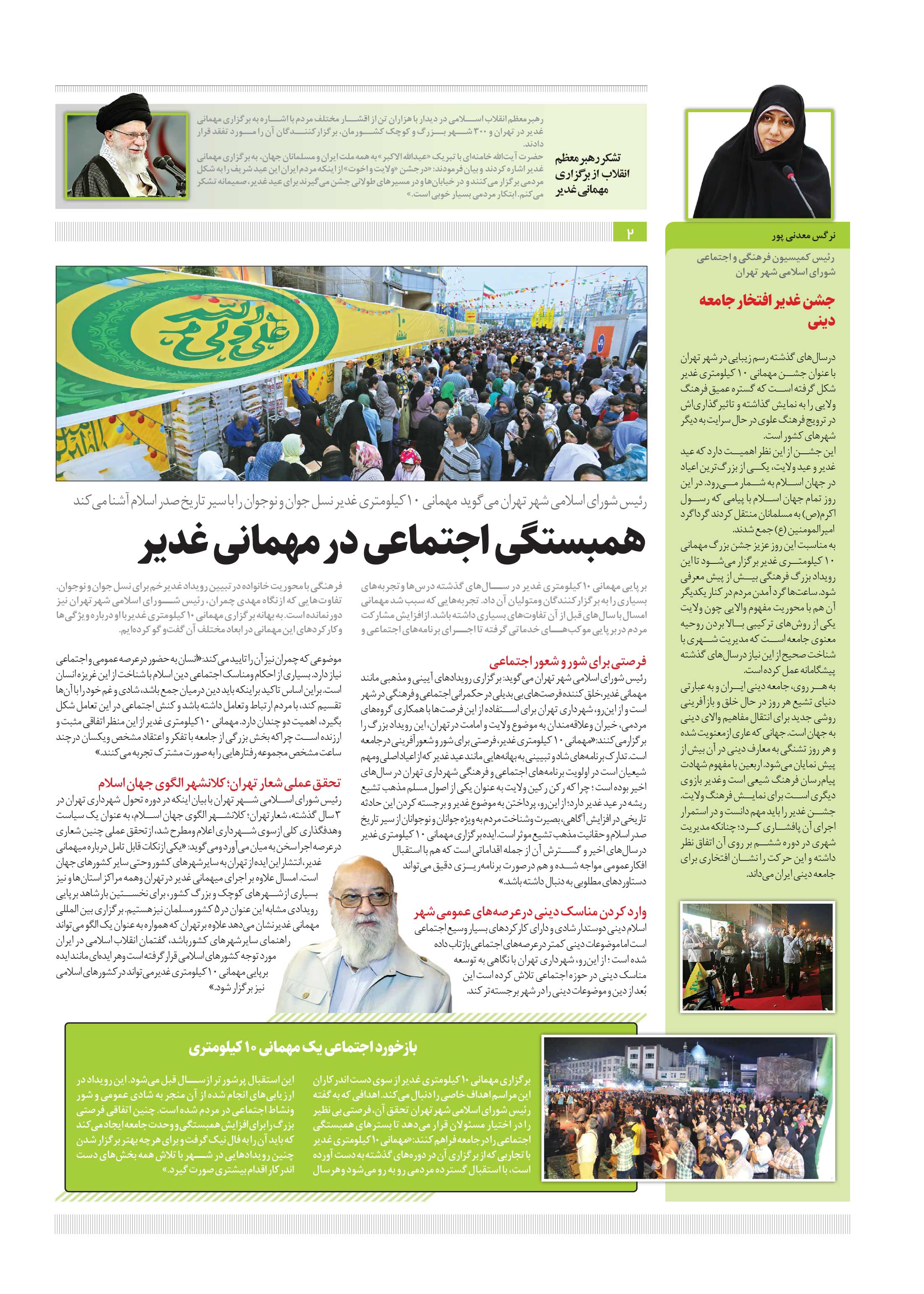 رهبرمعظم انقلاب اسلامی در دیدار با هزاران تن از اقشار مختلف مردم با اشاره به برگزاری مهمانی غدیر در تهران و ۳۰۰ شهر بزرگ و کوچک کشورمان، برگزارکنندگان آن را مورد تفقد قرار دادند.