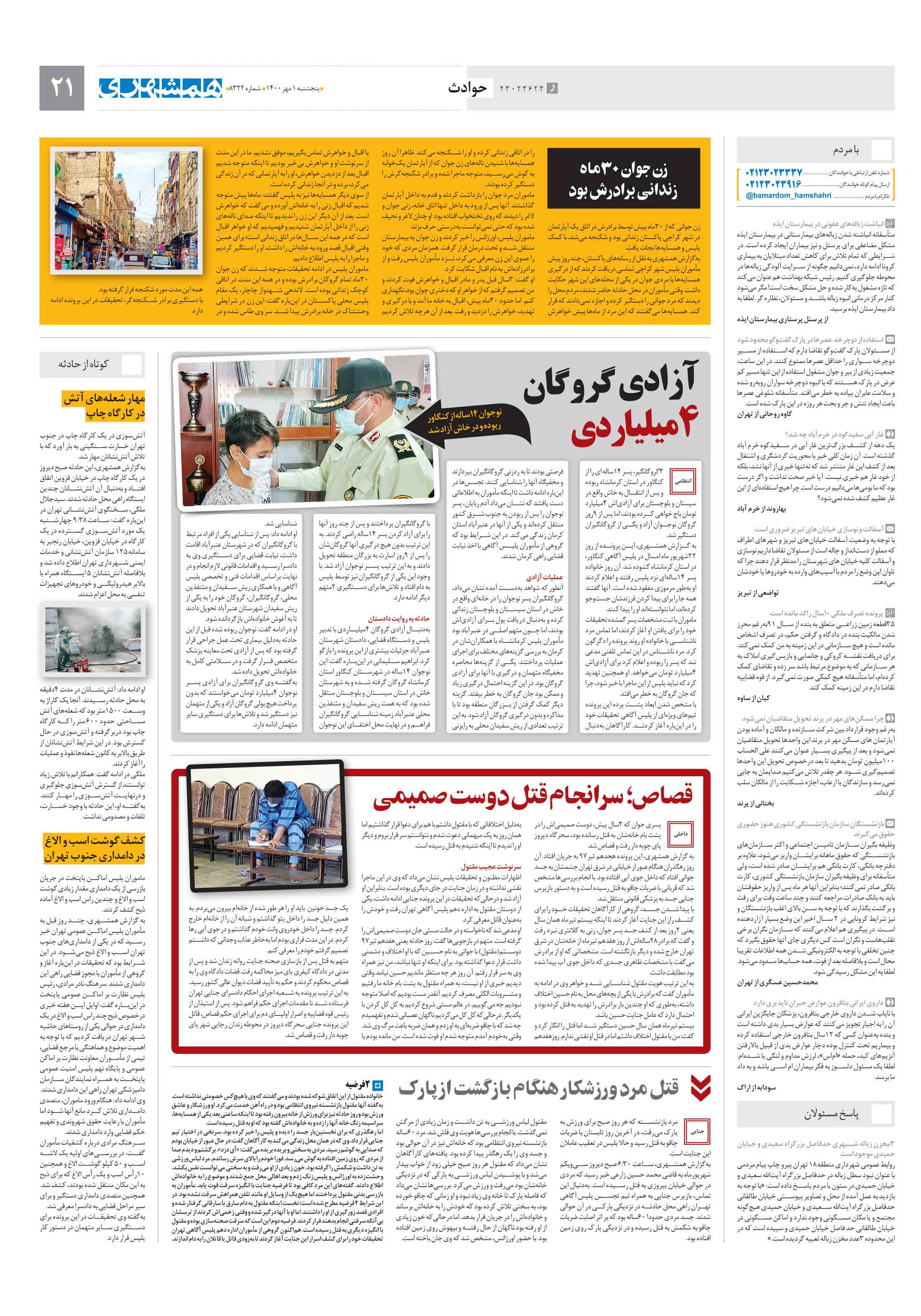 3گروگانگیر، پسر 14ساله ای را از کنگاور در استان کرمانشاه ربوده و پس از انتقال به خاش واقع در سیستان و بلوچستان برای آزادیاش 4میلیارد تومان باج خواهی کرده بودند، اما پس از 9روز گروگان نوجوان آزاد و یکی از گروگانگیران دستگیر شد.
