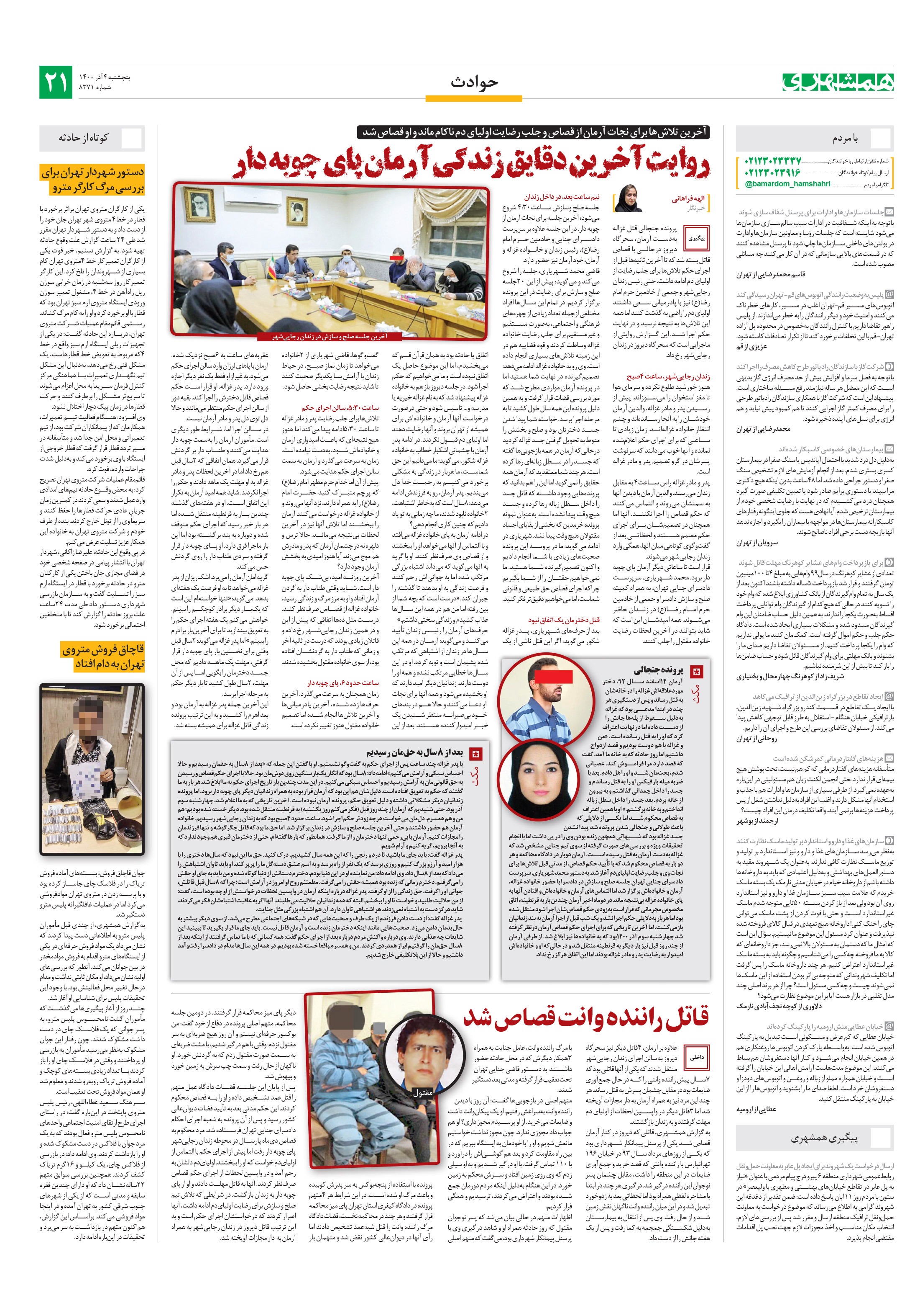 علاوه بر آرمان، 4قاتل دیگر نیز سحرگاه دیروز به سالن اجرای زندان رجاییشهر منتقل شدند که یکی از آنها قاتلی بود که 7سال پیش راننده وانتی را که در حال جمعآوری ضایعات بود در مقابل چشمان پسرش به قتل رساند. هر چند این مرد نیز به همراه آرمان به دار مجازات آویخته شد اما 3قاتل دیگر در واپسین لحظات از اولیای دم مهلت گرفتند و به زندان بازگشتند.