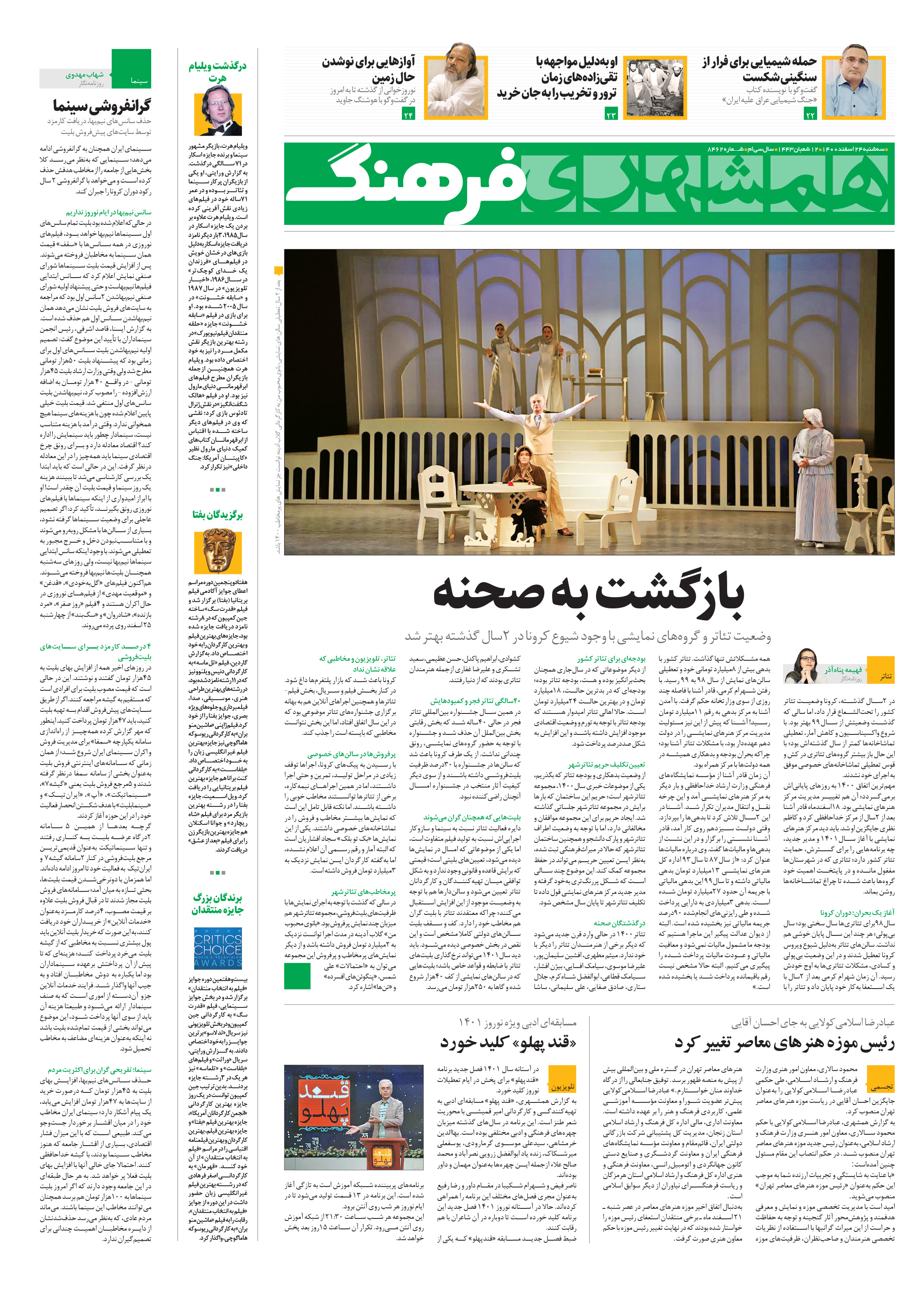 در 2سال گذشته، کرونا وضعیت تئاتر کشور را تحتالشعاع قرار داد، اما سالی که گذشت وضعیتش از سال99 بهتر بود. با شروع واکسیناسیون و کاهش آمار، تعطیلی تماشاخانهها کمتر از سال گذشتهاش بود؛ با این حال باز بیشتر گروههای تئاتری در کش و قوس تعطیلی تماشاخانههای خصوصی موفق به اجرای خود نشدند.